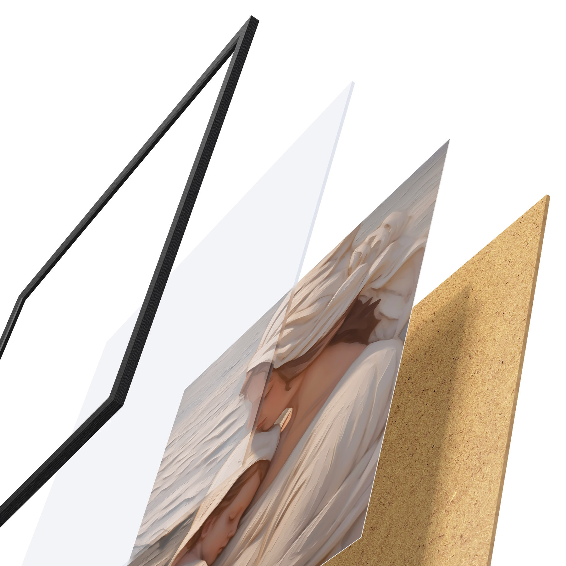 Das Poster besteht aus einem Rahmen, Plexiglas, einem gedruckten Bild und einer Rückwand aus Spanplatten. Dank der Halterungen auf der Rückseite kann das Poster sofort an die Wand gehängt werden.