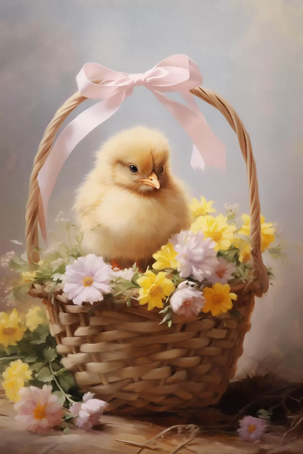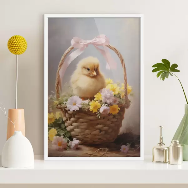 Poster Gelbes Küken in einem Korb mit Wildblumen f44384