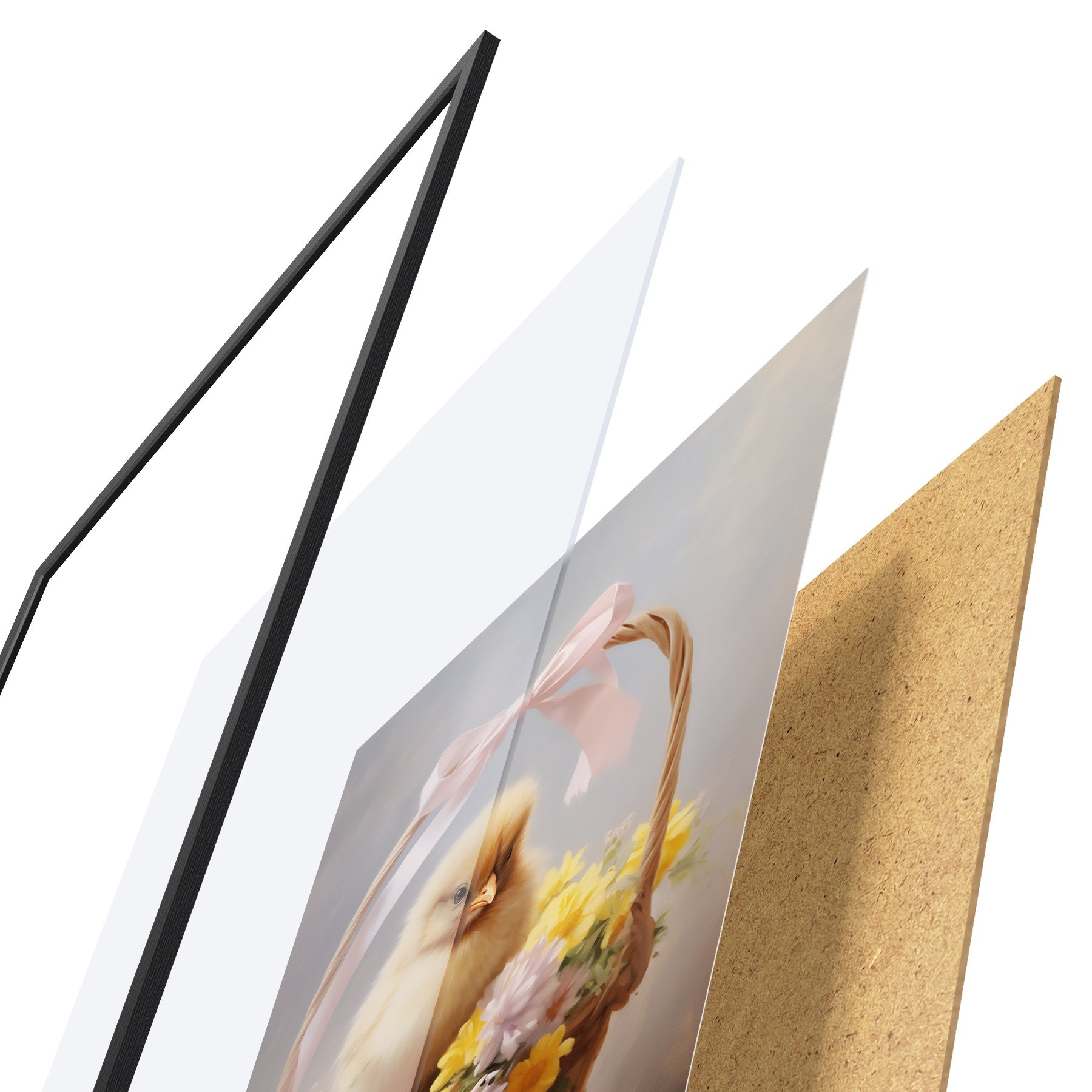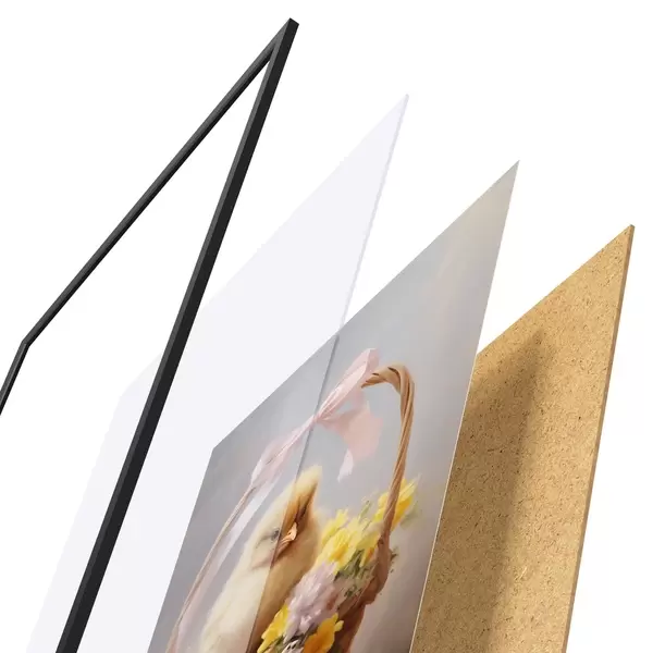 Das Poster besteht aus einem Rahmen, Plexiglas, einem gedruckten Bild und einer Rückwand aus Spanplatten. Dank der Halterungen auf der Rückseite kann das Poster sofort an die Wand gehängt werden.