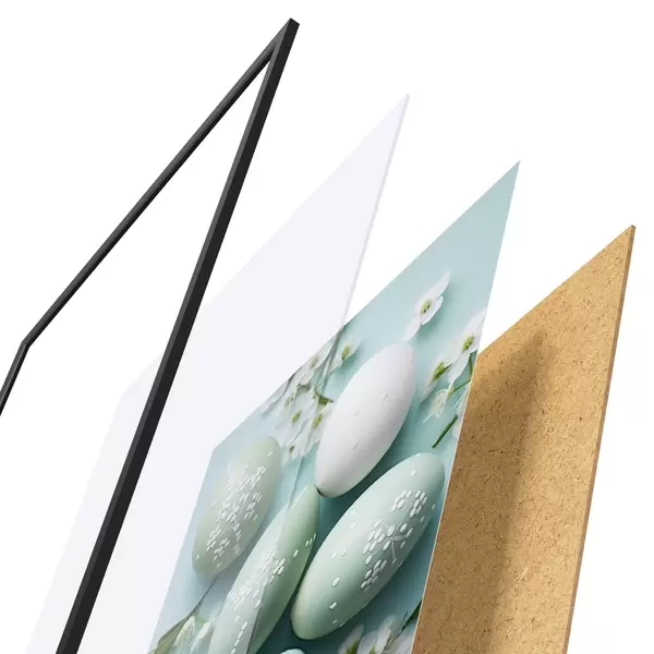 Das Poster besteht aus einem Rahmen, Plexiglas, einem gedruckten Bild und einer Rückwand aus Spanplatten. Dank der Halterungen auf der Rückseite kann das Poster sofort an die Wand gehängt werden.