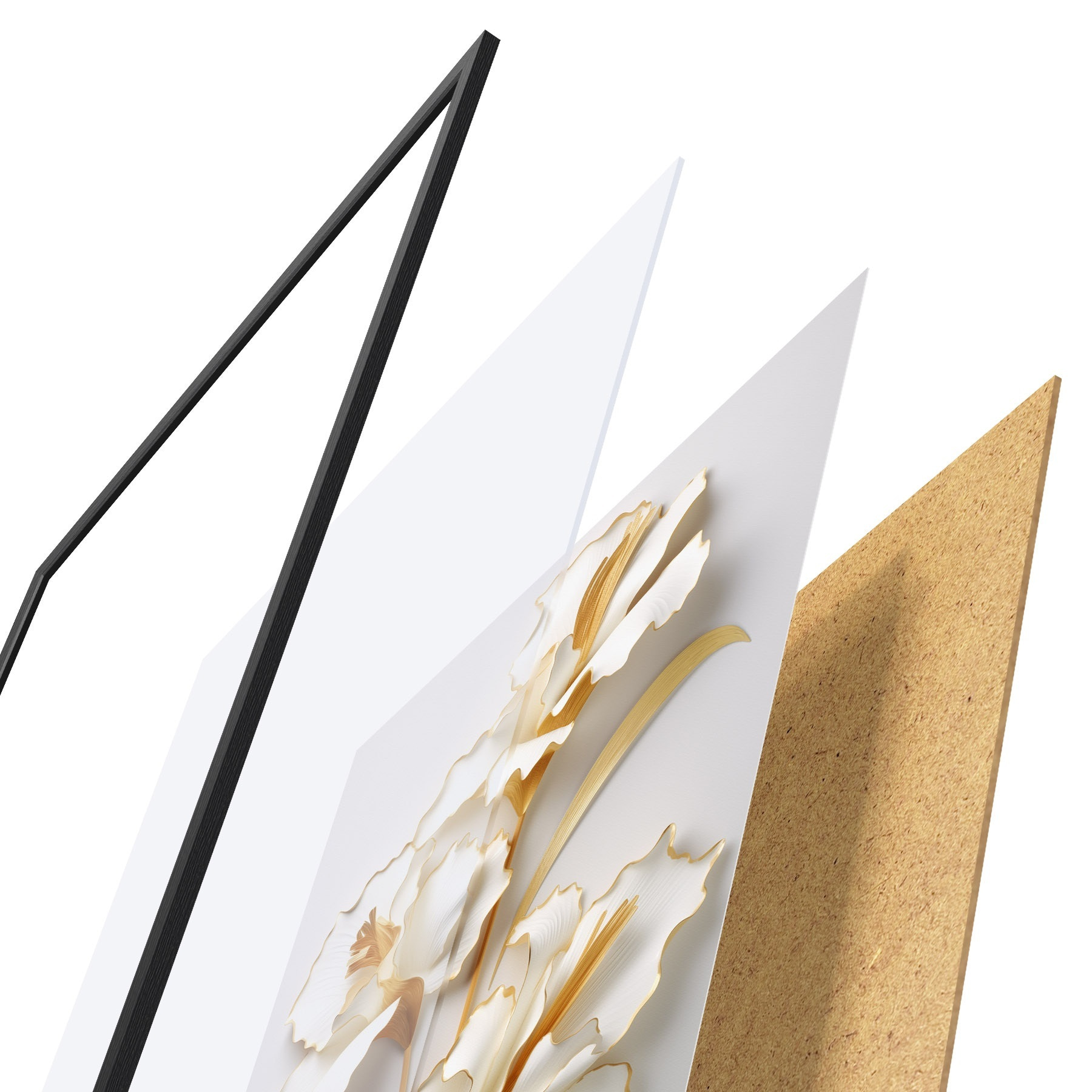 Das Poster besteht aus einem Rahmen, Plexiglas, einem gedruckten Bild und einer Rückwand aus Spanplatten. Dank der Halterungen auf der Rückseite kann das Poster sofort an die Wand gehängt werden.