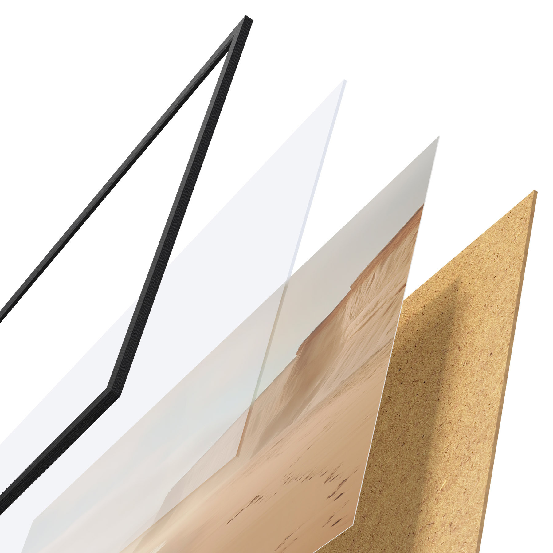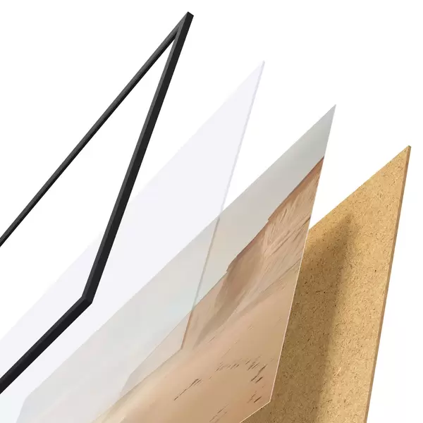 Das Poster besteht aus einem Rahmen, Plexiglas, einem gedruckten Bild und einer Rückwand aus Spanplatten. Dank der Halterungen auf der Rückseite kann das Poster sofort an die Wand gehängt werden.