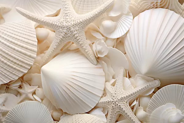 Poster Dekorative weiße Muscheln und Seesterne, die eine strukturierte monochromatische Komposition bilden Nr f44392