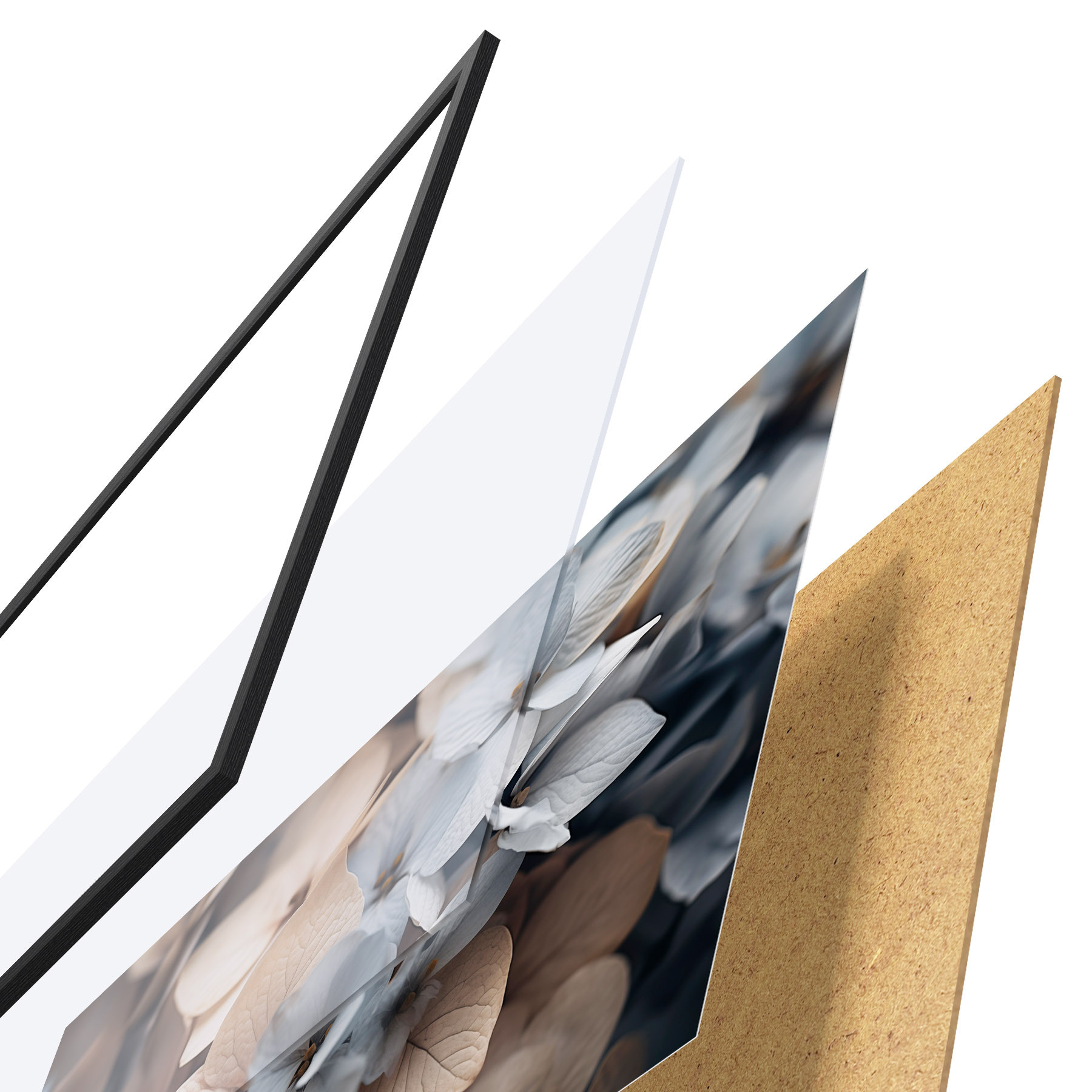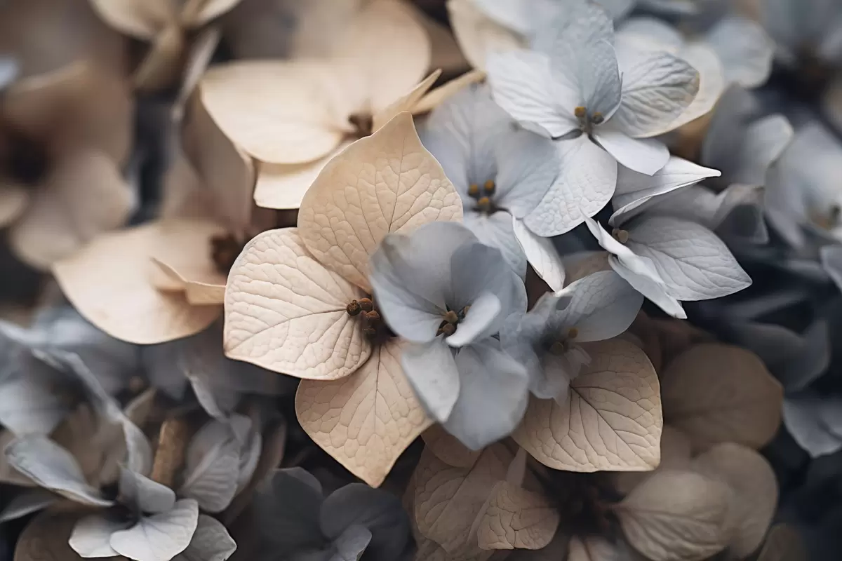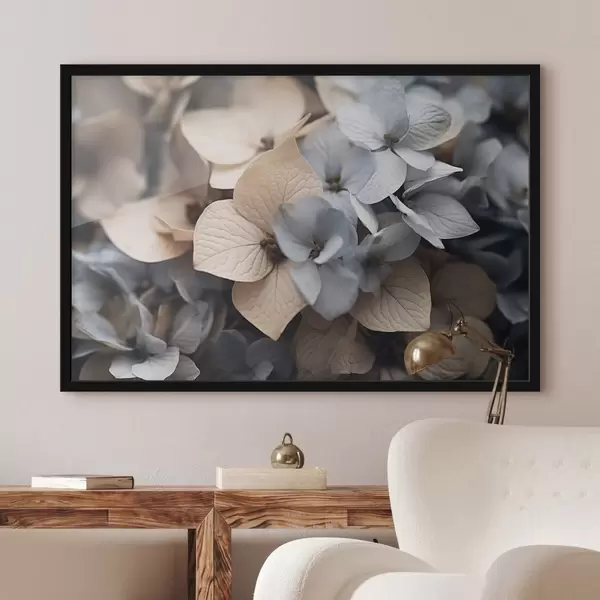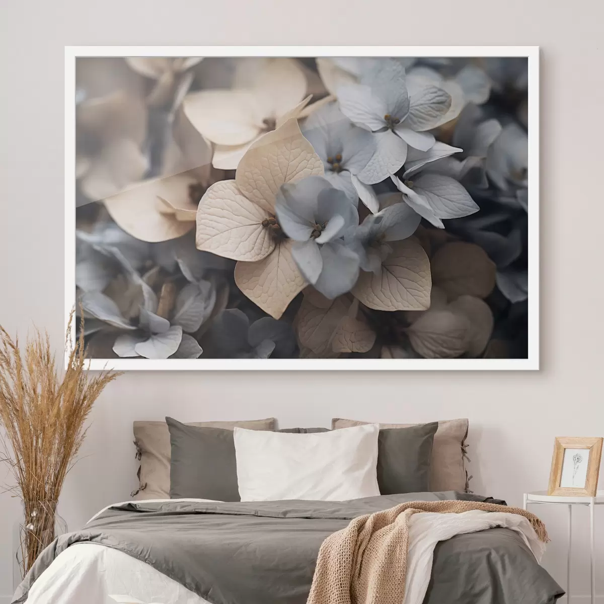 Poster Hortensienblüten, hellblaue und beige Blütenblätter, mit detaillierten Texturen, elegantes Blumenarrangement Nr f44394
