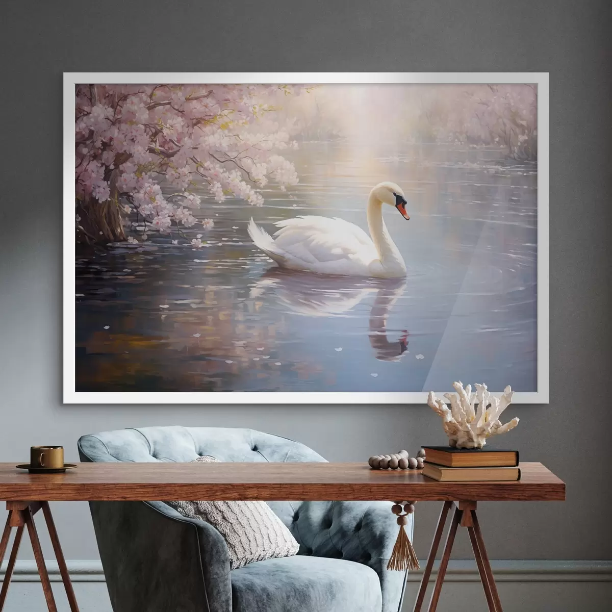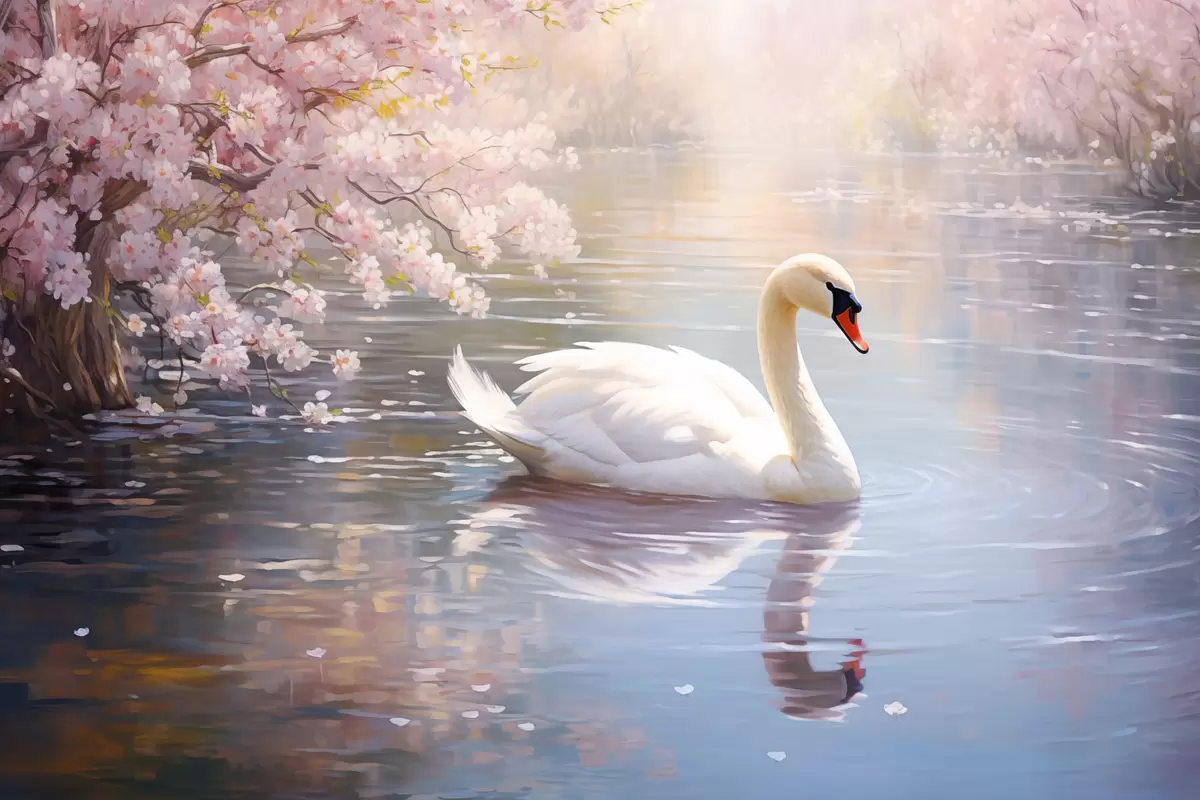 Poster Ein weißer Schwan schwimmt in einem See mit Kirschblütenbäumen, Pastellfarben Nr f44396