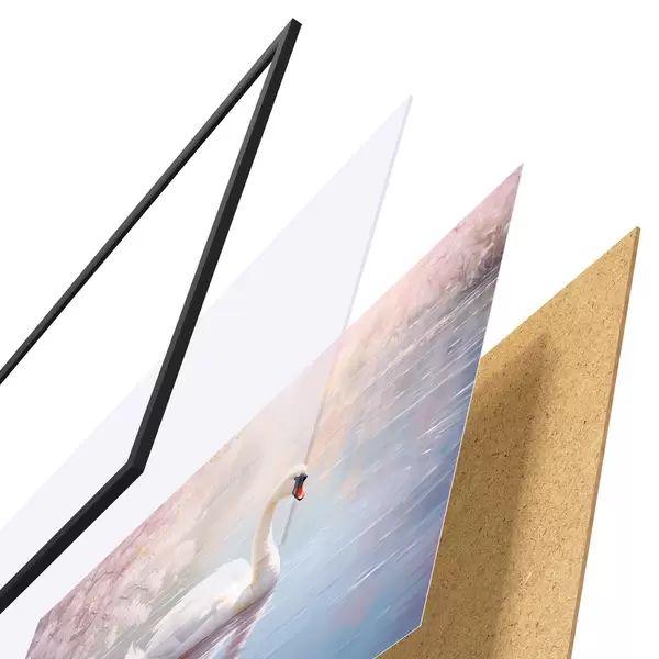 Das Poster besteht aus einem Rahmen, Plexiglas, einem gedruckten Bild und einer Rückwand aus Spanplatten. Dank der Halterungen auf der Rückseite kann das Poster sofort an die Wand gehängt werden.