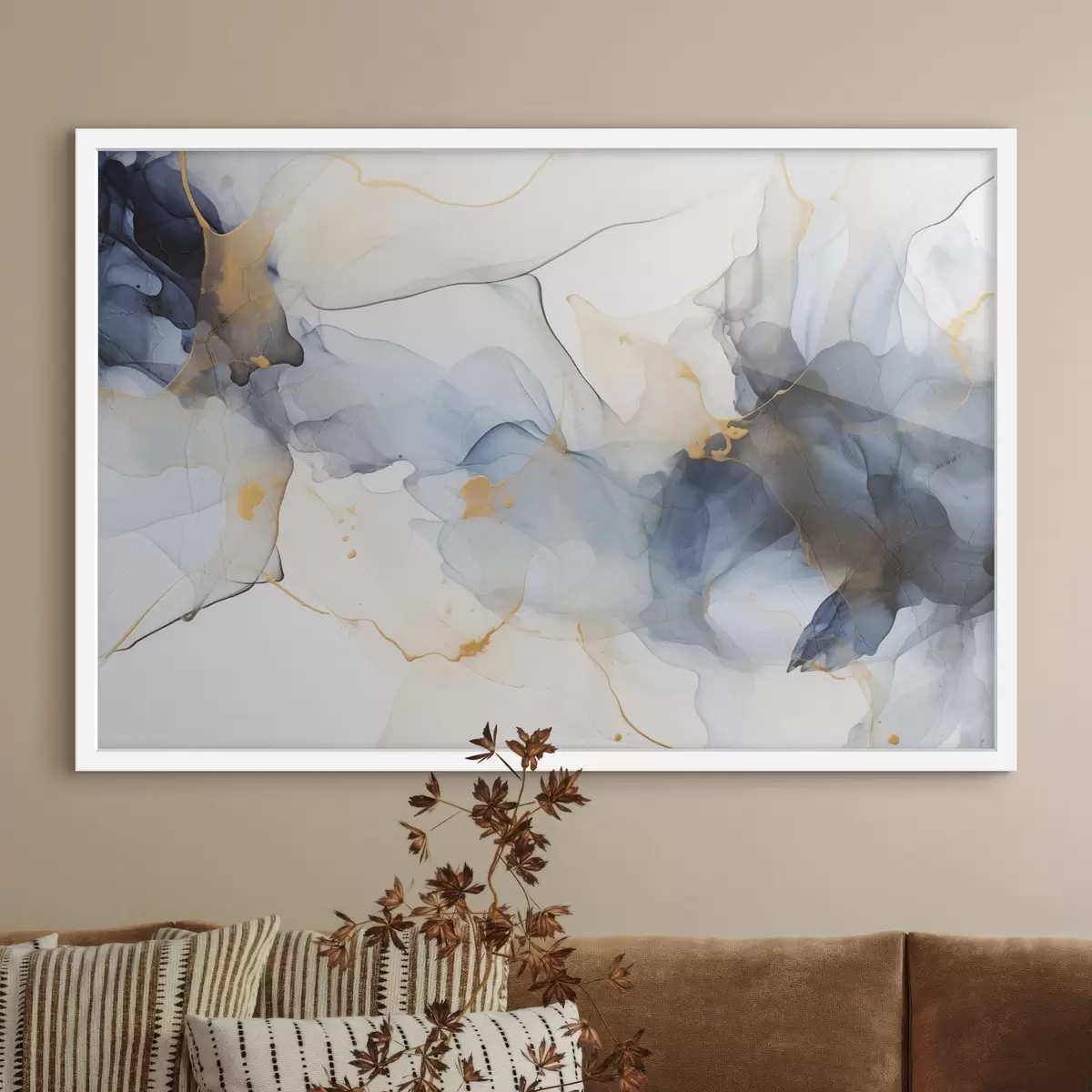 Poster Abstrakte Malerei mit blauer Tinte, fließende und organische Formen, zarte Texturen auf weißem Hintergrund f44397