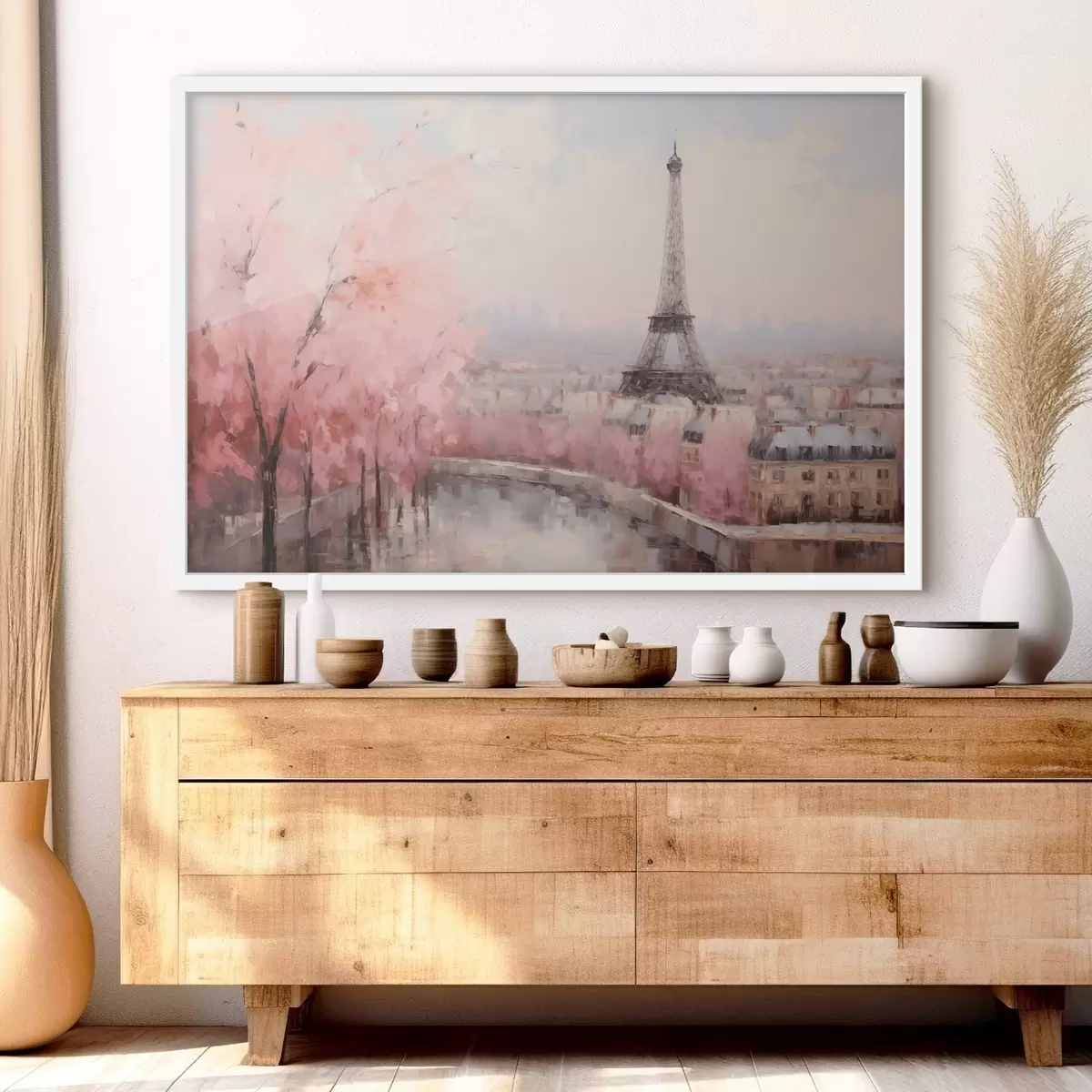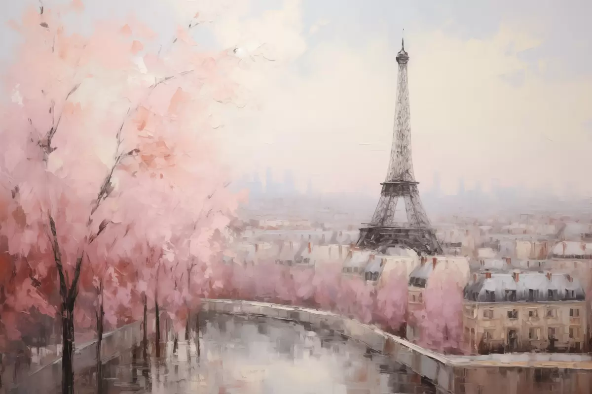 Poster Eiffelturm in Paris mit Kirschblütenbäumen im Frühling, sanfte Pastellfarben f44398