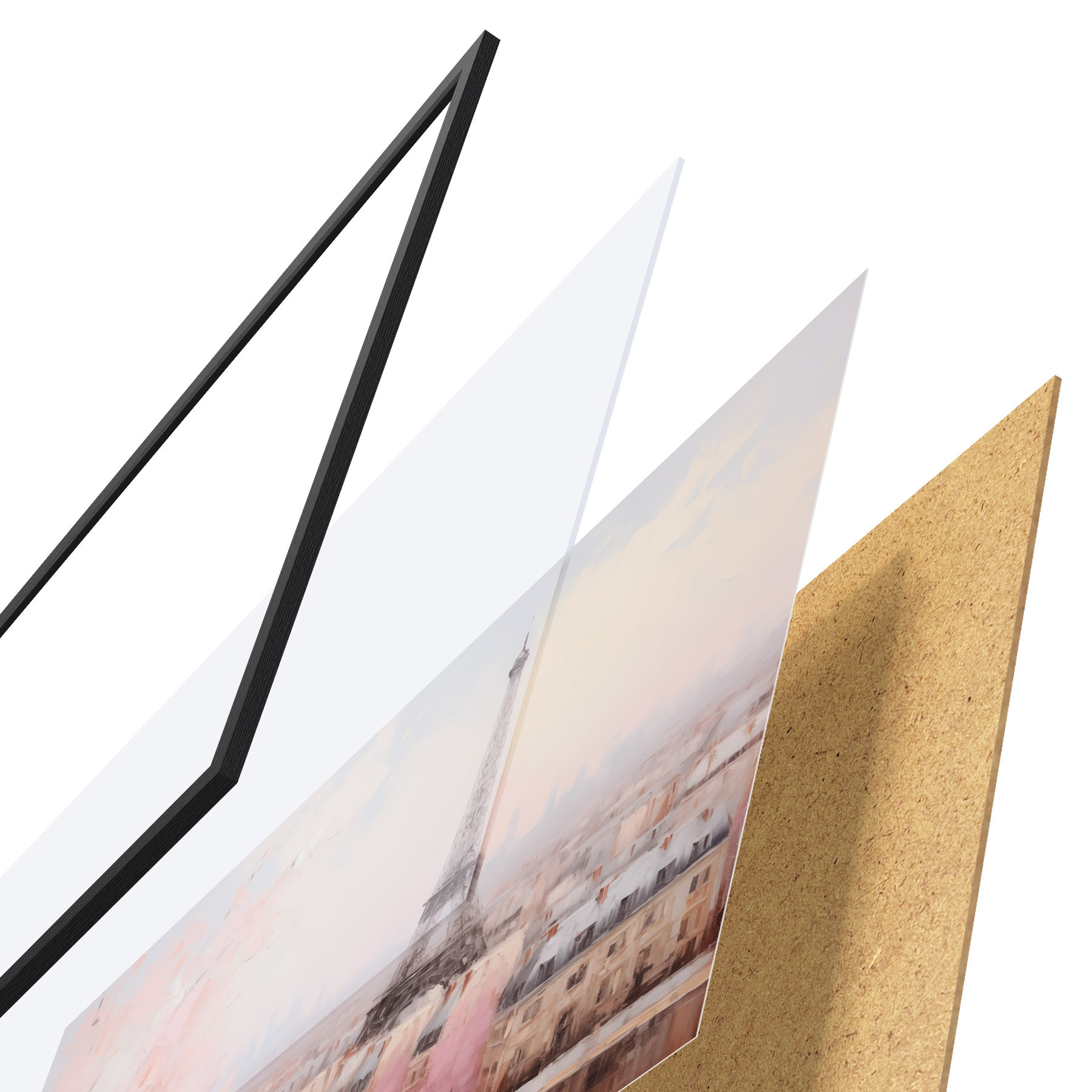 Das Poster besteht aus einem Rahmen, Plexiglas, einem gedruckten Bild und einer Rückwand aus Spanplatten. Dank der Halterungen auf der Rückseite kann das Poster sofort an die Wand gehängt werden.