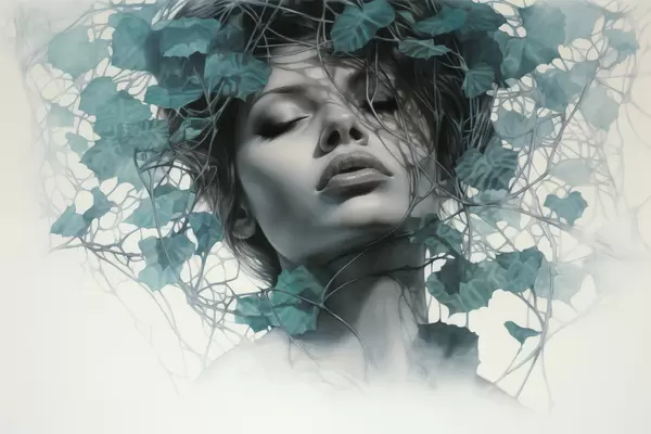 Poster Porträt einer Frau mit geschlossenen Augen, umgeben von grünen Blättern und Zweigen Nr f44399