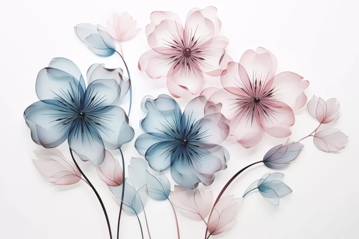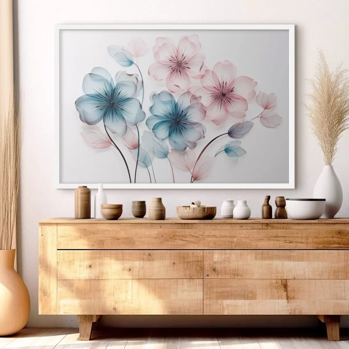 Poster Transluzente, gedämpfte rosa und blaue Blüten mit sichtbaren Staubgefäßen und Stielen Nr f44405