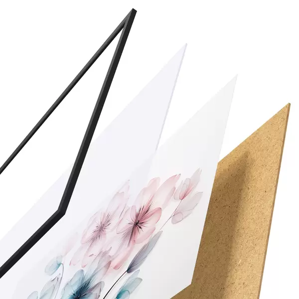 Das Poster besteht aus einem Rahmen, Plexiglas, einem gedruckten Bild und einer Rückwand aus Spanplatten. Dank der Halterungen auf der Rückseite kann das Poster sofort an die Wand gehängt werden.