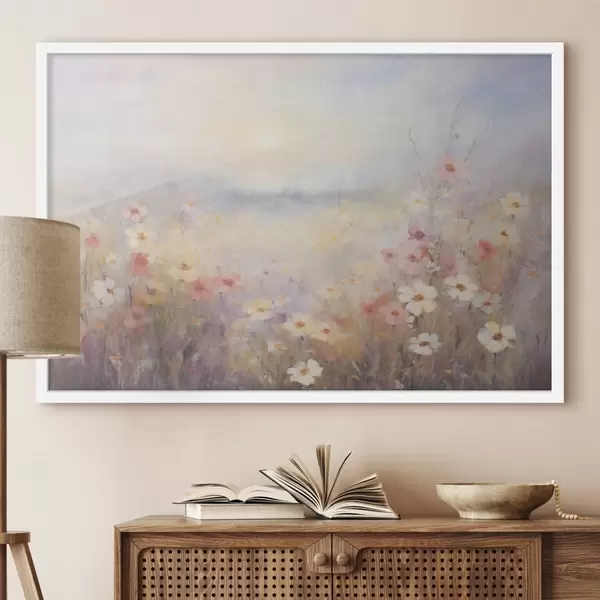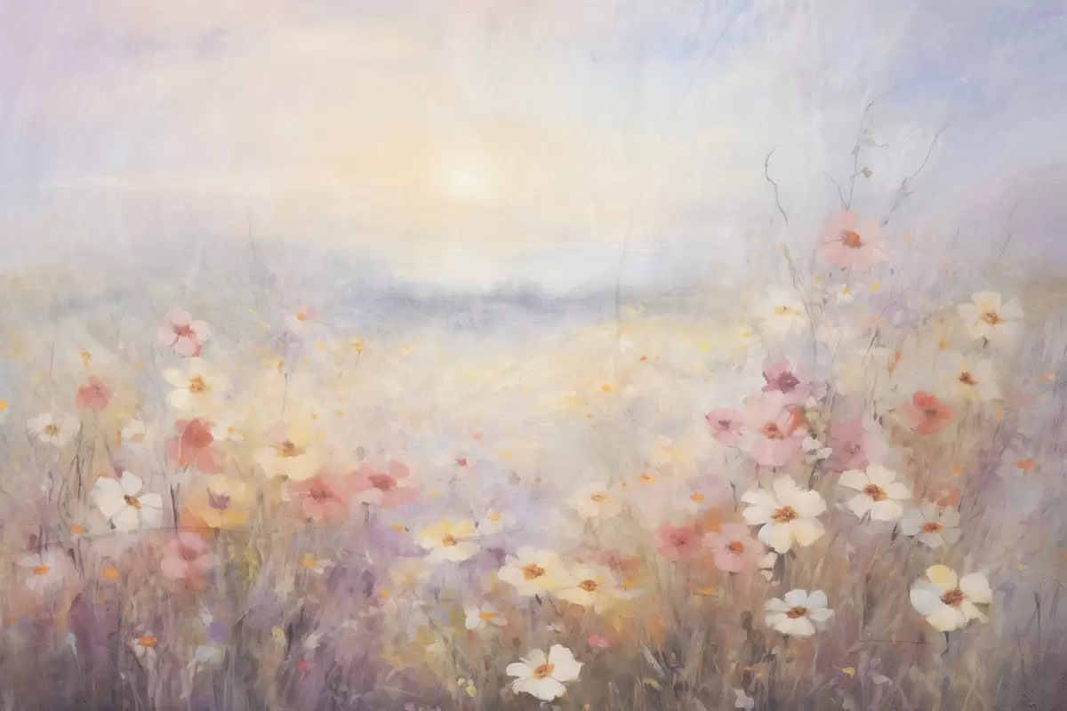 Poster Strukturierte sonnige Landschaft eines Blumenfeldes, weiche Pastellfarben, verträumte Atmosphäre Nr f44408