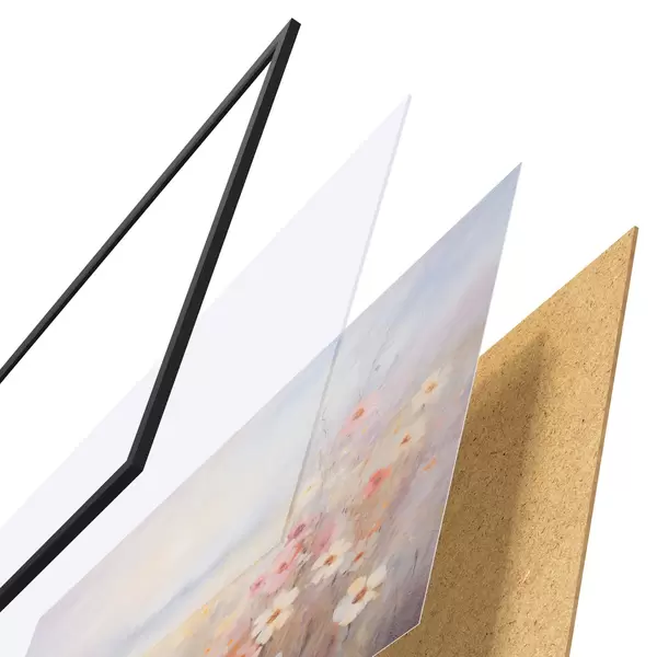 Das Poster besteht aus einem Rahmen, Plexiglas, einem gedruckten Bild und einer Rückwand aus Spanplatten. Dank der Halterungen auf der Rückseite kann das Poster sofort an die Wand gehängt werden.