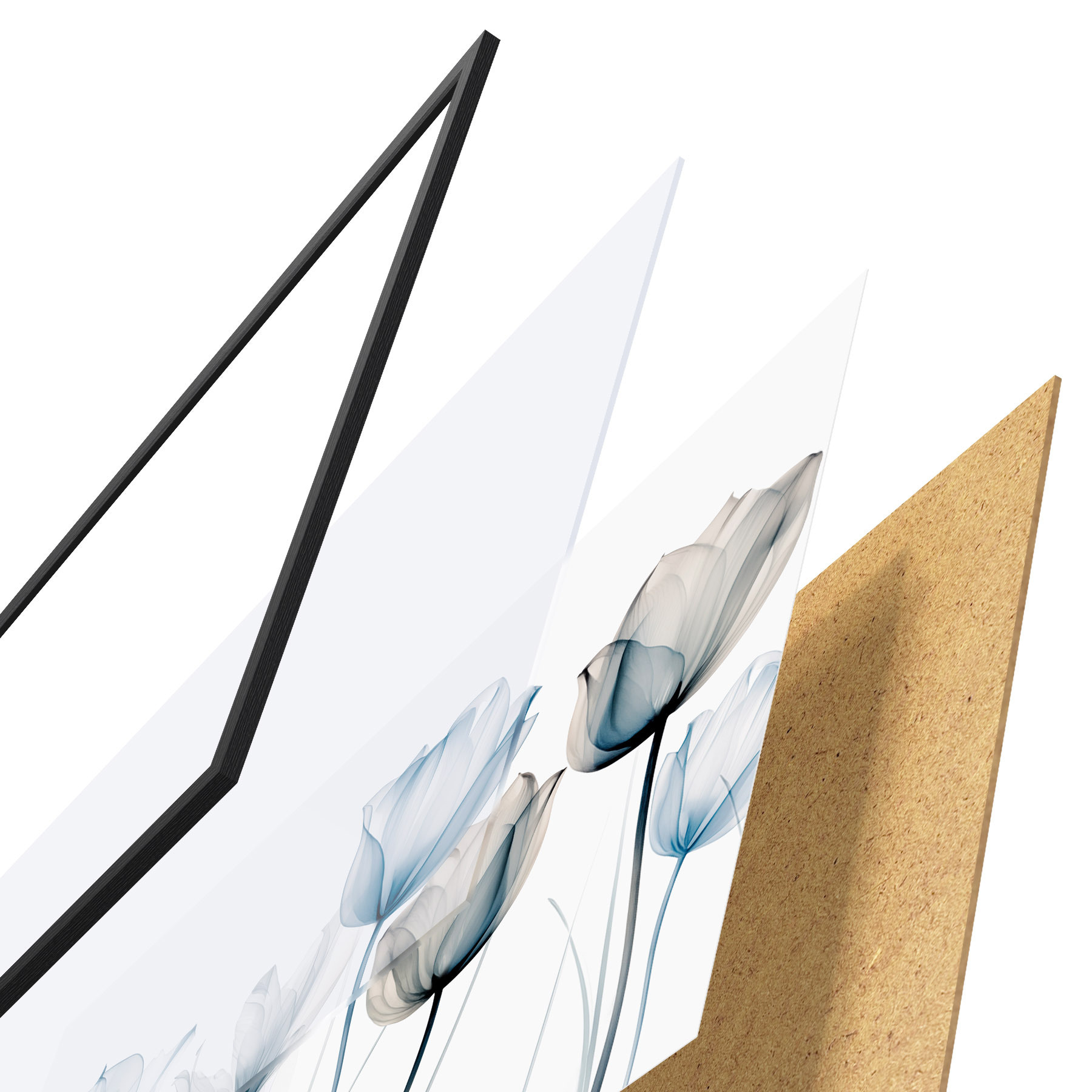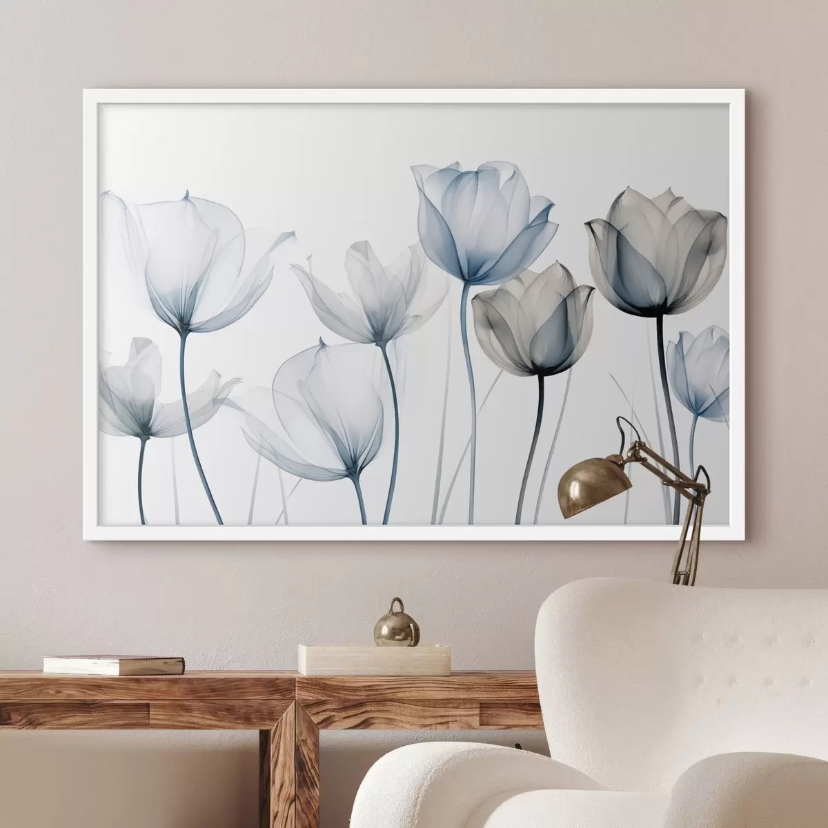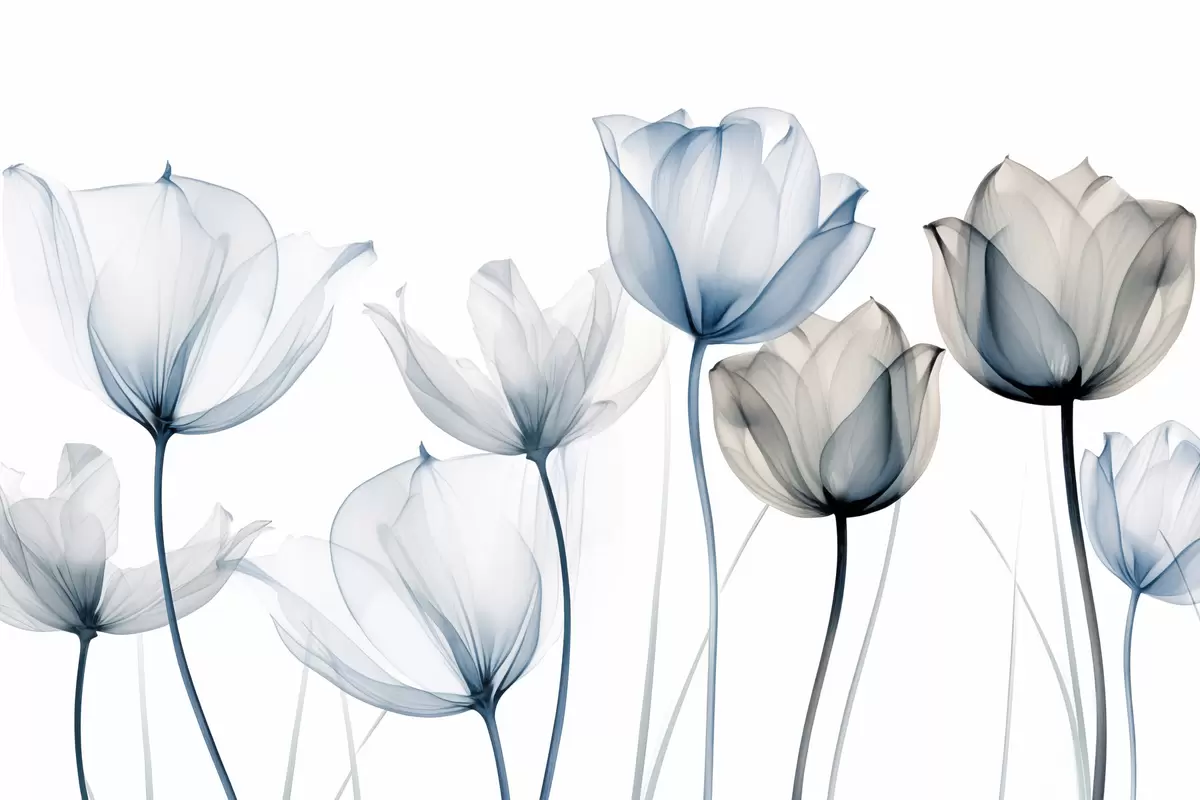 Poster Transluzente blaue und weiße Tulpen mit langen Stielen, vor einem schlichten weißen Hintergrund f44409
