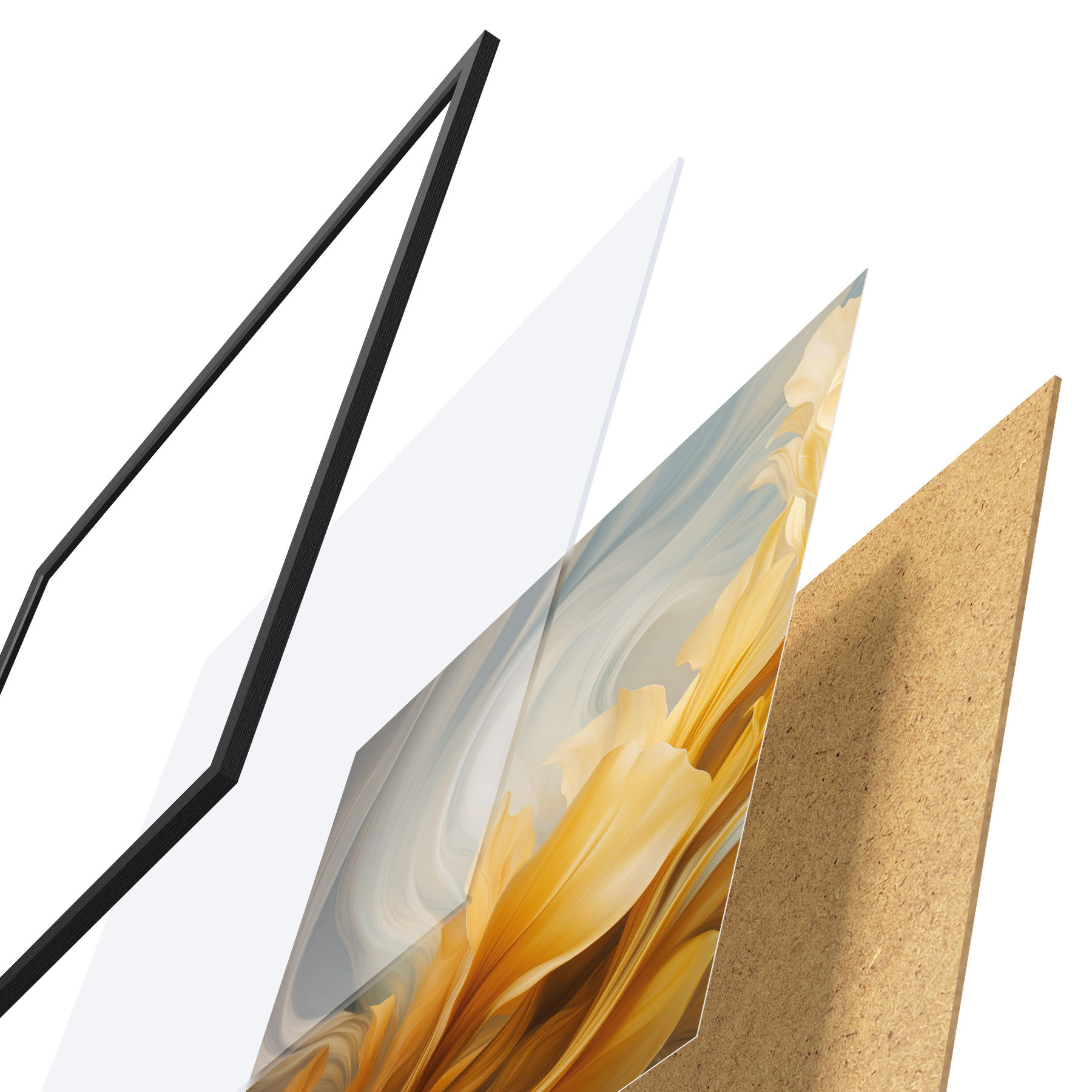 Das Poster besteht aus einem Rahmen, Plexiglas, einem gedruckten Bild und einer Rückwand aus Spanplatten. Dank der Halterungen auf der Rückseite kann das Poster sofort an die Wand gehängt werden.