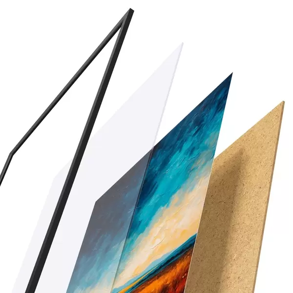 Das Poster besteht aus einem Rahmen, Plexiglas, einem gedruckten Bild und einer Rückwand aus Spanplatten. Dank der Halterungen auf der Rückseite kann das Poster sofort an die Wand gehängt werden.