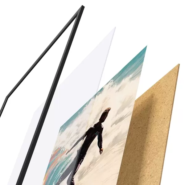 Das Poster besteht aus einem Rahmen, Plexiglas, einem gedruckten Bild und einer Rückwand aus Spanplatten. Dank der Halterungen auf der Rückseite kann das Poster sofort an die Wand gehängt werden.