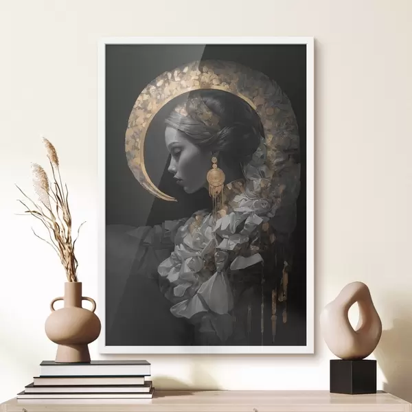 Poster Mädchen und gelbe Mondsichel auf schwarzem Hintergrund Nr f44449