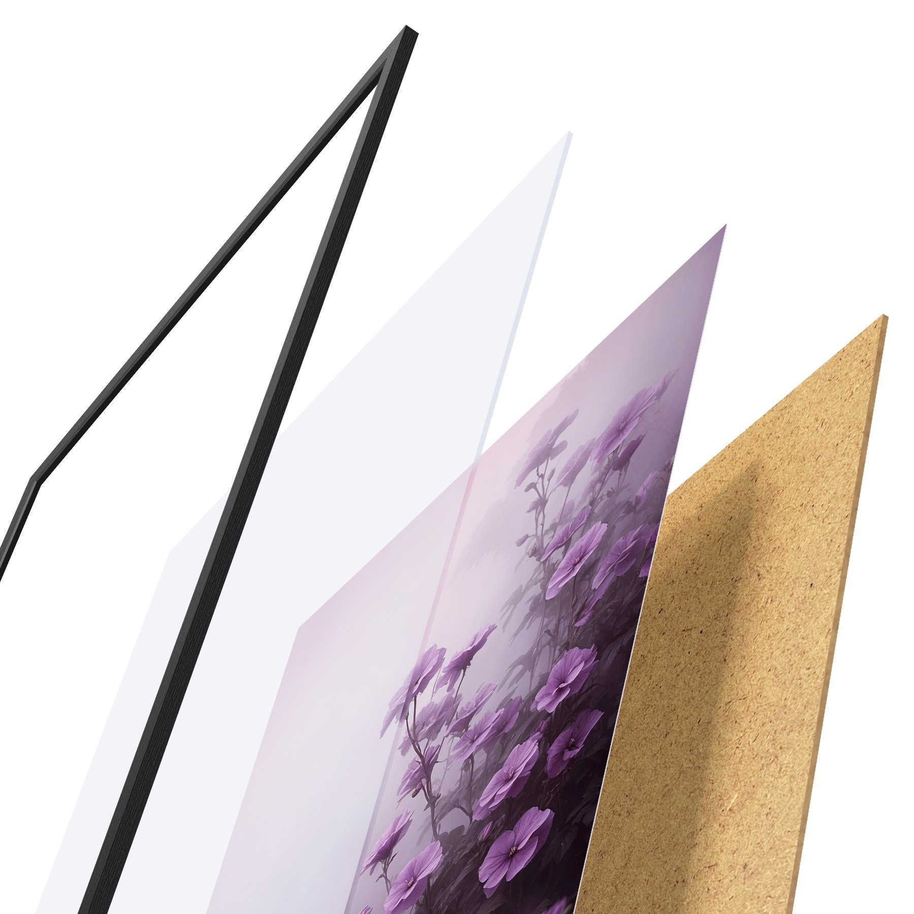 Das Poster besteht aus einem Rahmen, Plexiglas, einem gedruckten Bild und einer Rückwand aus Spanplatten. Dank der Halterungen auf der Rückseite kann das Poster sofort an die Wand gehängt werden.