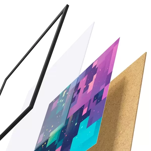 Das Poster besteht aus einem Rahmen, Plexiglas, einem gedruckten Bild und einer Rückwand aus Spanplatten. Dank der Halterungen auf der Rückseite kann das Poster sofort an die Wand gehängt werden.