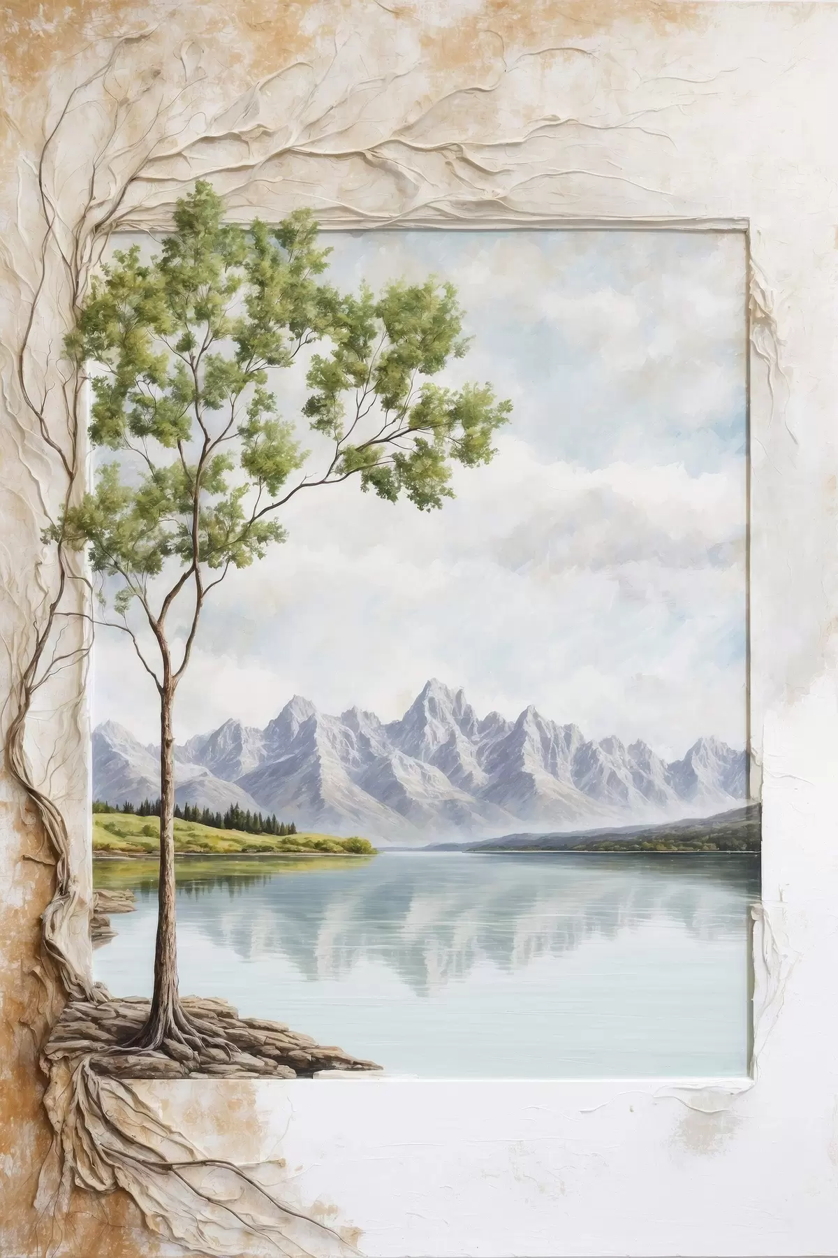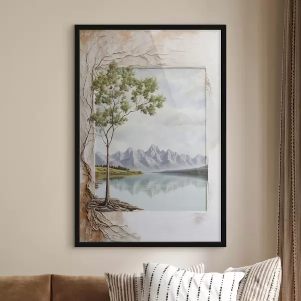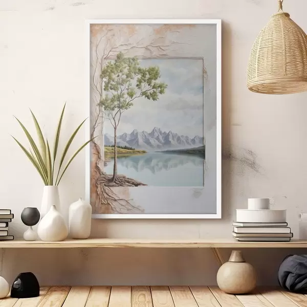 Poster Blick auf den See und verschneite Berge im Rahmen f44458