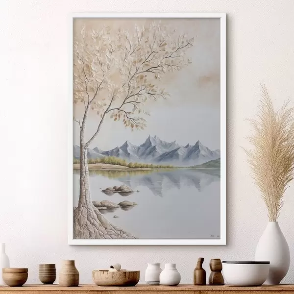 Poster Baum auf See und verschneite Berge im Hintergrund Nr f44459