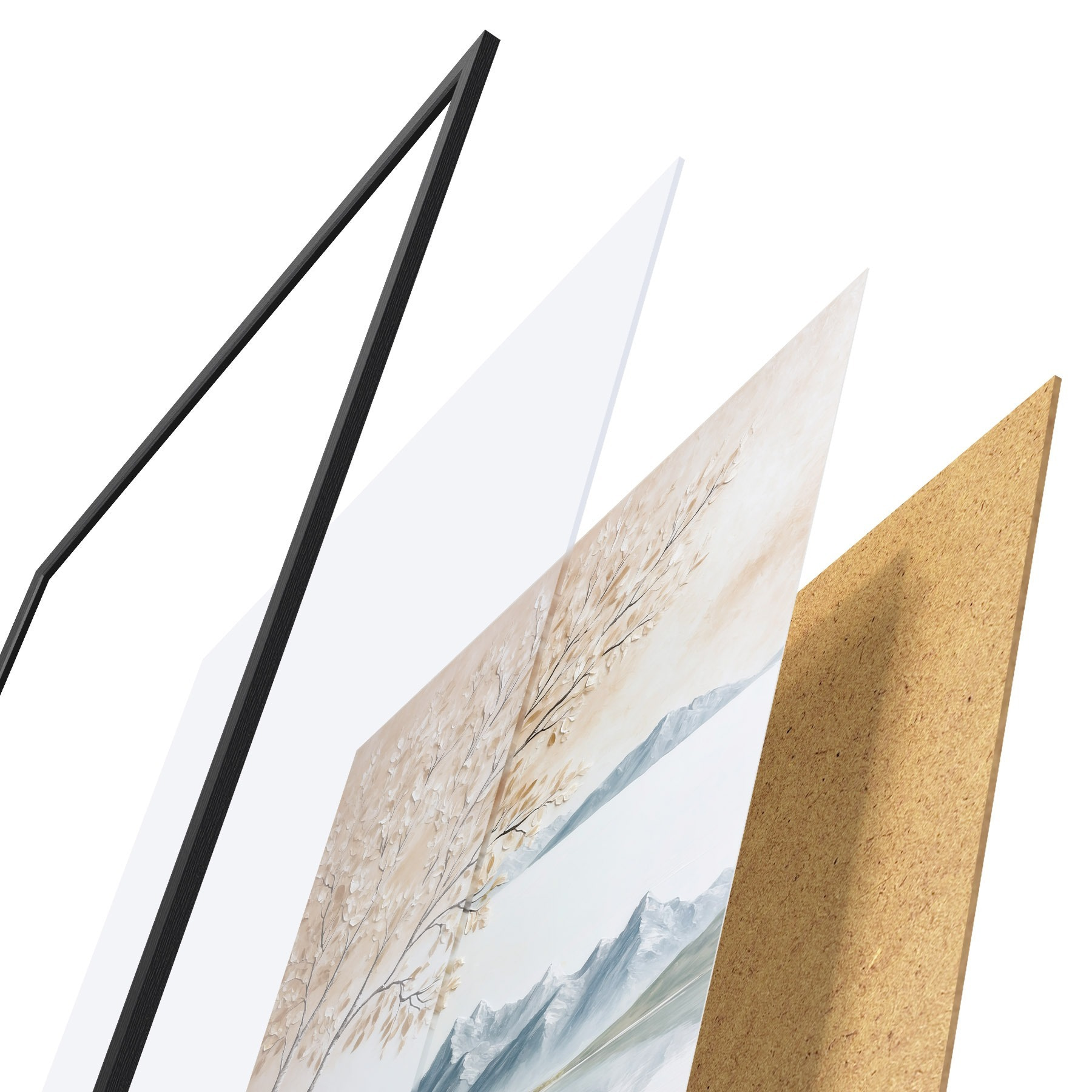 Das Poster besteht aus einem Rahmen, Plexiglas, einem gedruckten Bild und einer Rückwand aus Spanplatten. Dank der Halterungen auf der Rückseite kann das Poster sofort an die Wand gehängt werden.