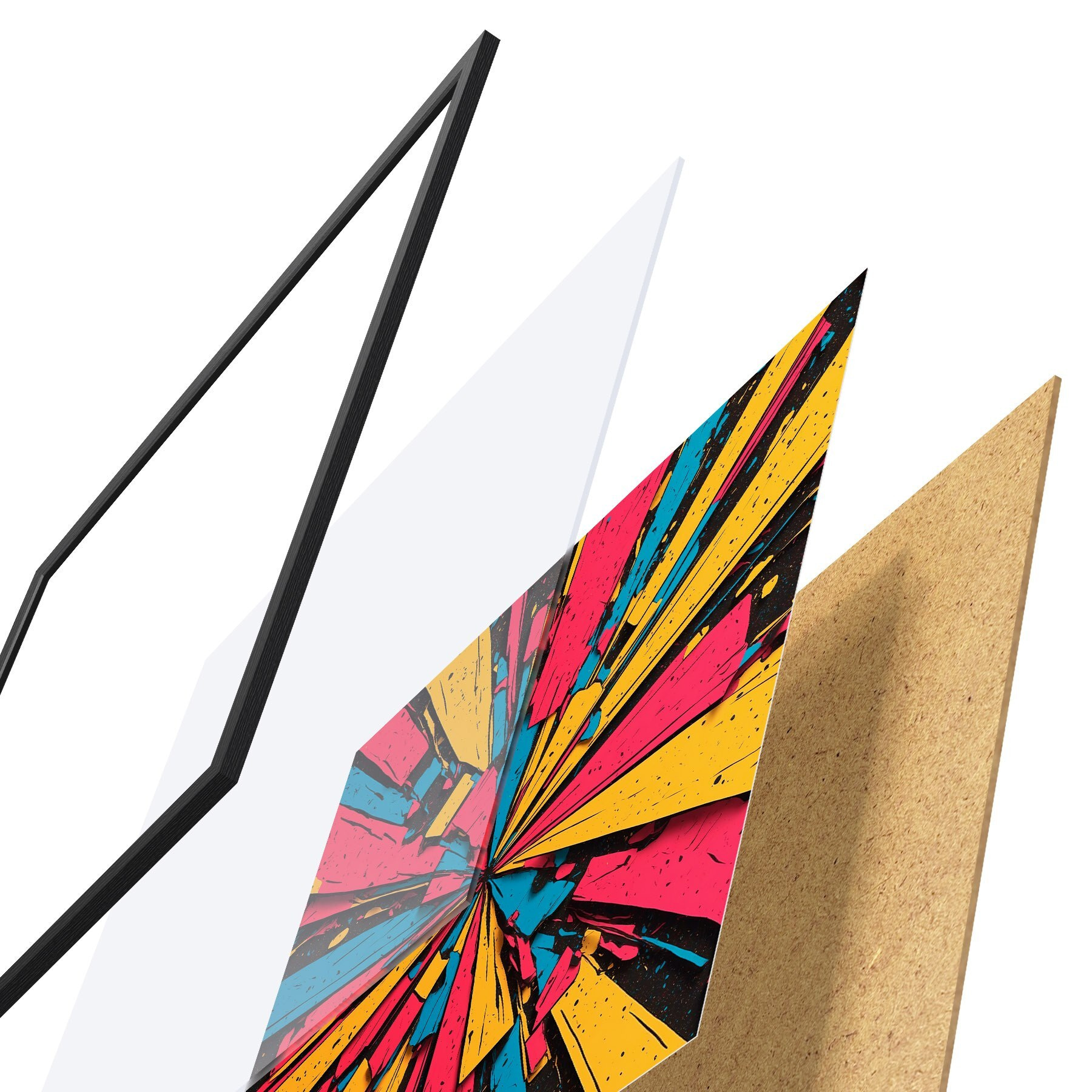 Das Poster besteht aus einem Rahmen, Plexiglas, einem gedruckten Bild und einer Rückwand aus Spanplatten. Dank der Halterungen auf der Rückseite kann das Poster sofort an die Wand gehängt werden.