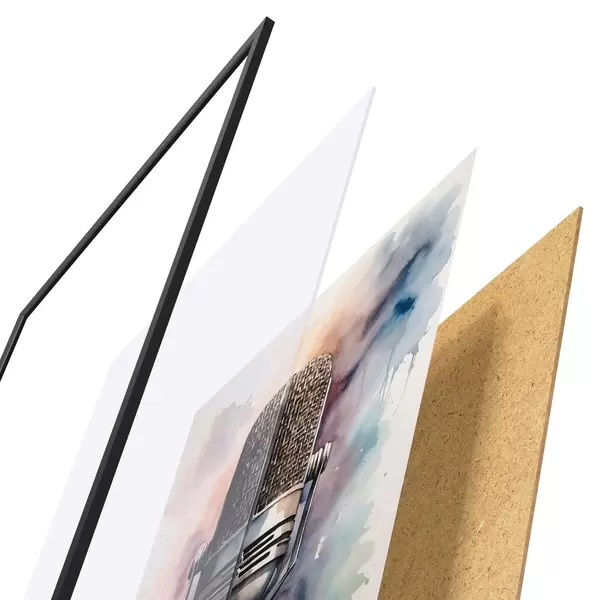 Das Poster besteht aus einem Rahmen, Plexiglas, einem gedruckten Bild und einer Rückwand aus Spanplatten. Dank der Halterungen auf der Rückseite kann das Poster sofort an die Wand gehängt werden.