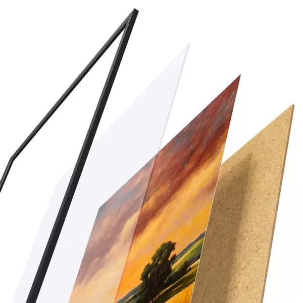 Das Poster besteht aus einem Rahmen, Plexiglas, einem gedruckten Bild und einer Rückwand aus Spanplatten. Dank der Halterungen auf der Rückseite kann das Poster sofort an die Wand gehängt werden.