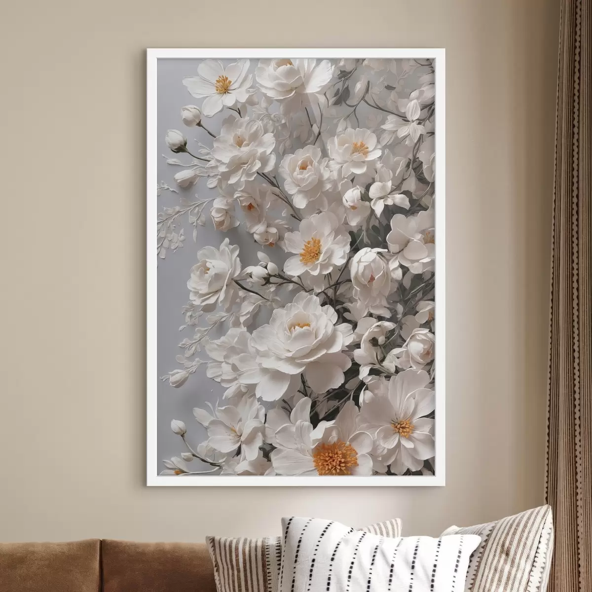 Poster Weiße Blumen und Blätter auf weißem Hintergrund Nr f44465