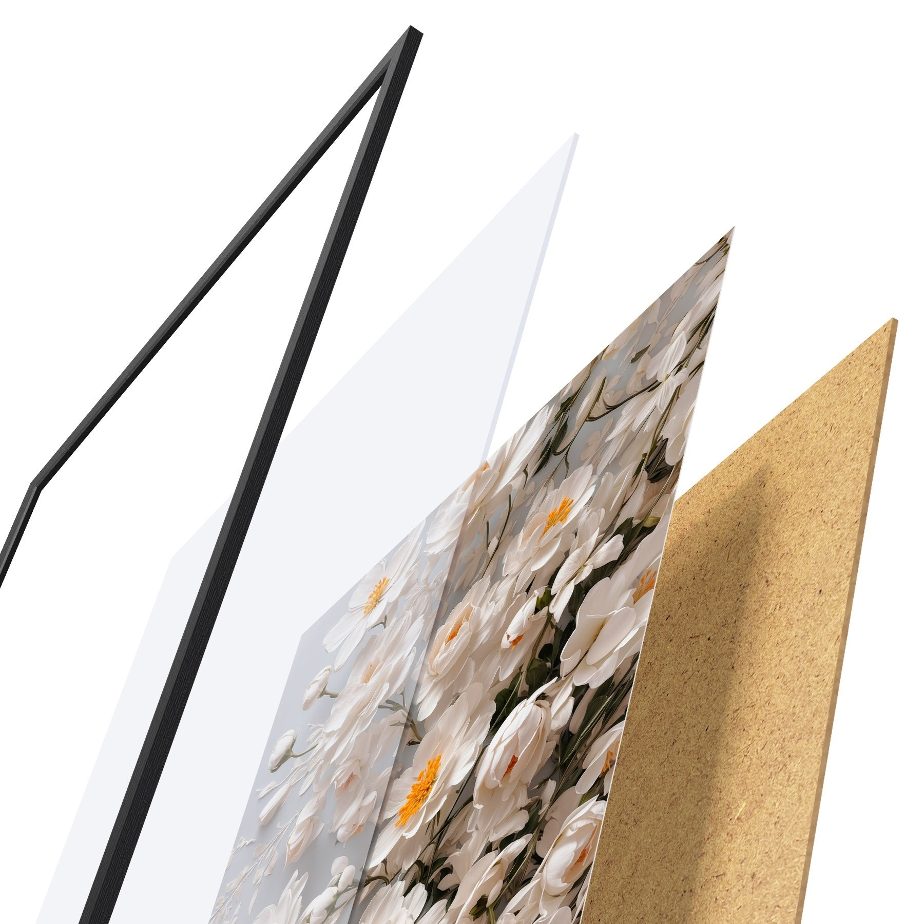 Das Poster besteht aus einem Rahmen, Plexiglas, einem gedruckten Bild und einer Rückwand aus Spanplatten. Dank der Halterungen auf der Rückseite kann das Poster sofort an die Wand gehängt werden.