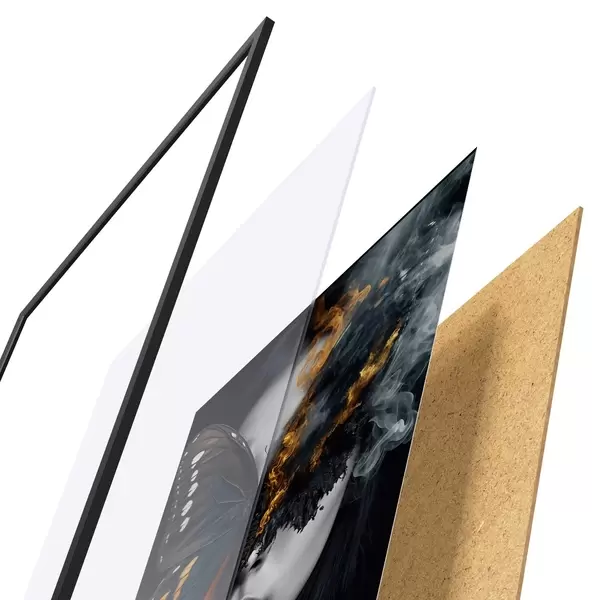 Das Poster besteht aus einem Rahmen, Plexiglas, einem gedruckten Bild und einer Rückwand aus Spanplatten. Dank der Halterungen auf der Rückseite kann das Poster sofort an die Wand gehängt werden.