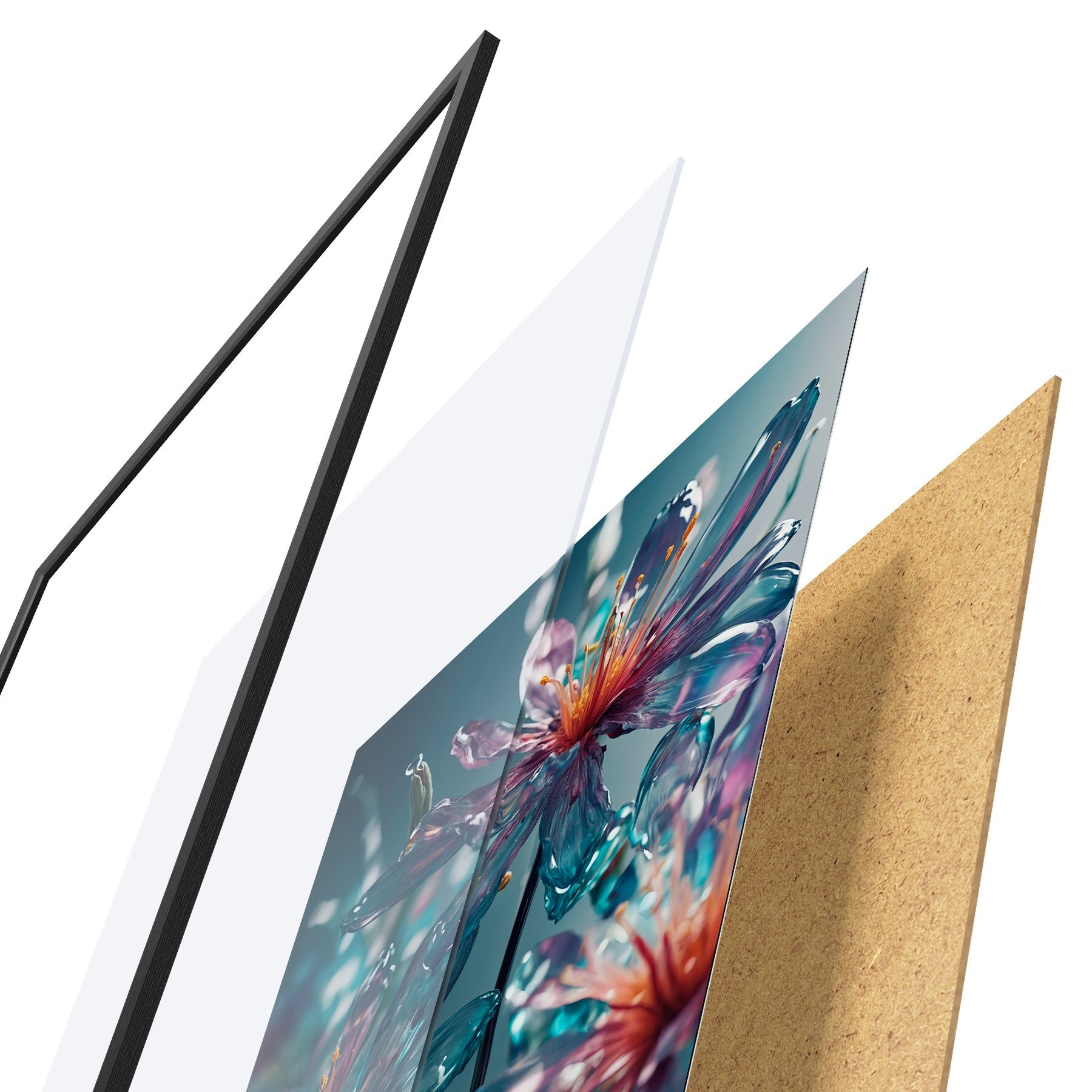 Das Poster besteht aus einem Rahmen, Plexiglas, einem gedruckten Bild und einer Rückwand aus Spanplatten. Dank der Halterungen auf der Rückseite kann das Poster sofort an die Wand gehängt werden.