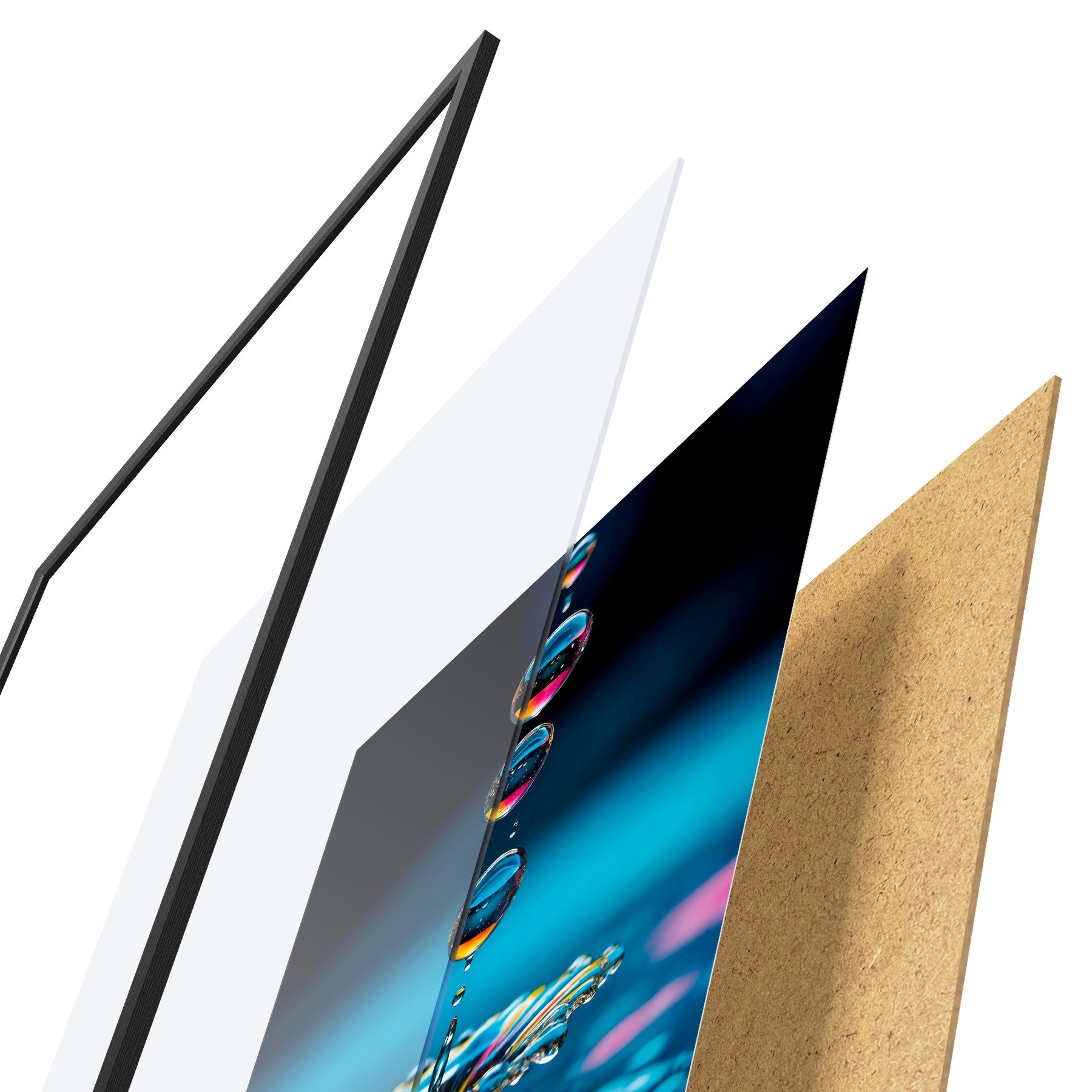 Das Poster besteht aus einem Rahmen, Plexiglas, einem gedruckten Bild und einer Rückwand aus Spanplatten. Dank der Halterungen auf der Rückseite kann das Poster sofort an die Wand gehängt werden.