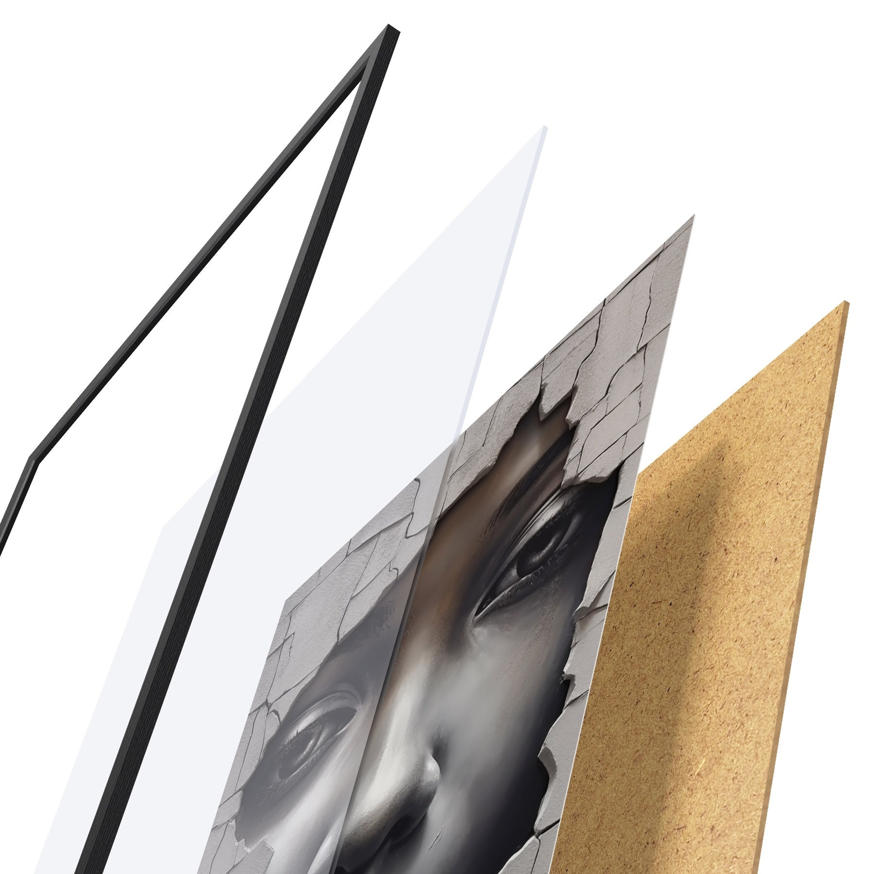Das Poster besteht aus einem Rahmen, Plexiglas, einem gedruckten Bild und einer Rückwand aus Spanplatten. Dank der Halterungen auf der Rückseite kann das Poster sofort an die Wand gehängt werden.