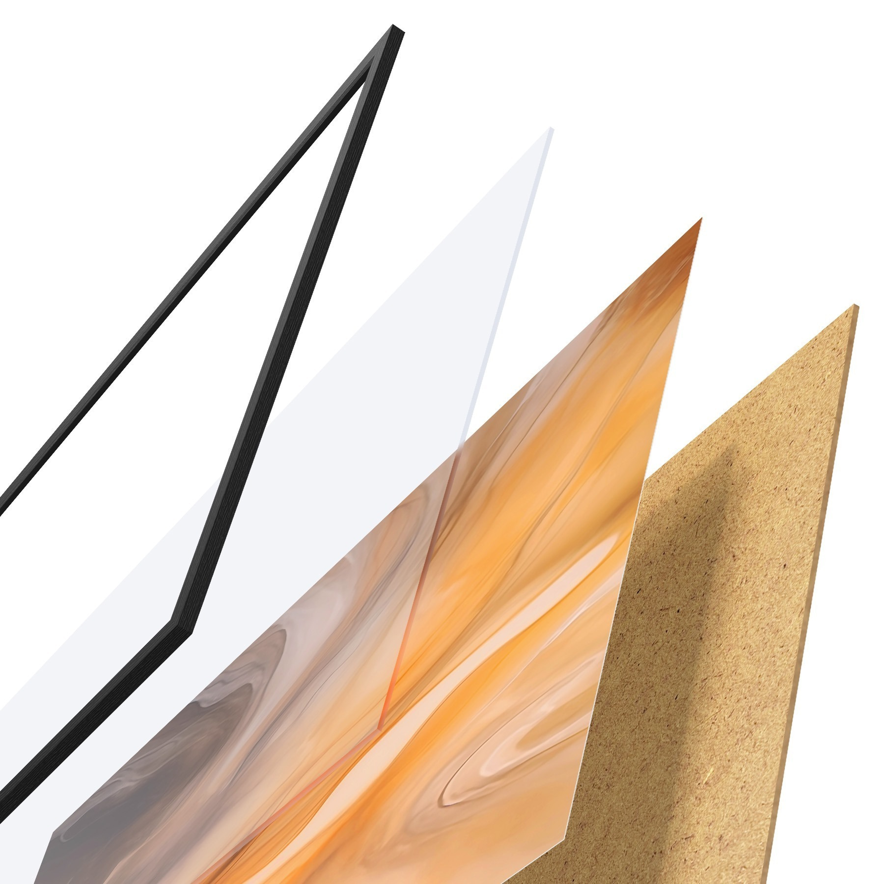 Das Poster besteht aus einem Rahmen, Plexiglas, einem gedruckten Bild und einer Rückwand aus Spanplatten. Dank der Halterungen auf der Rückseite kann das Poster sofort an die Wand gehängt werden.