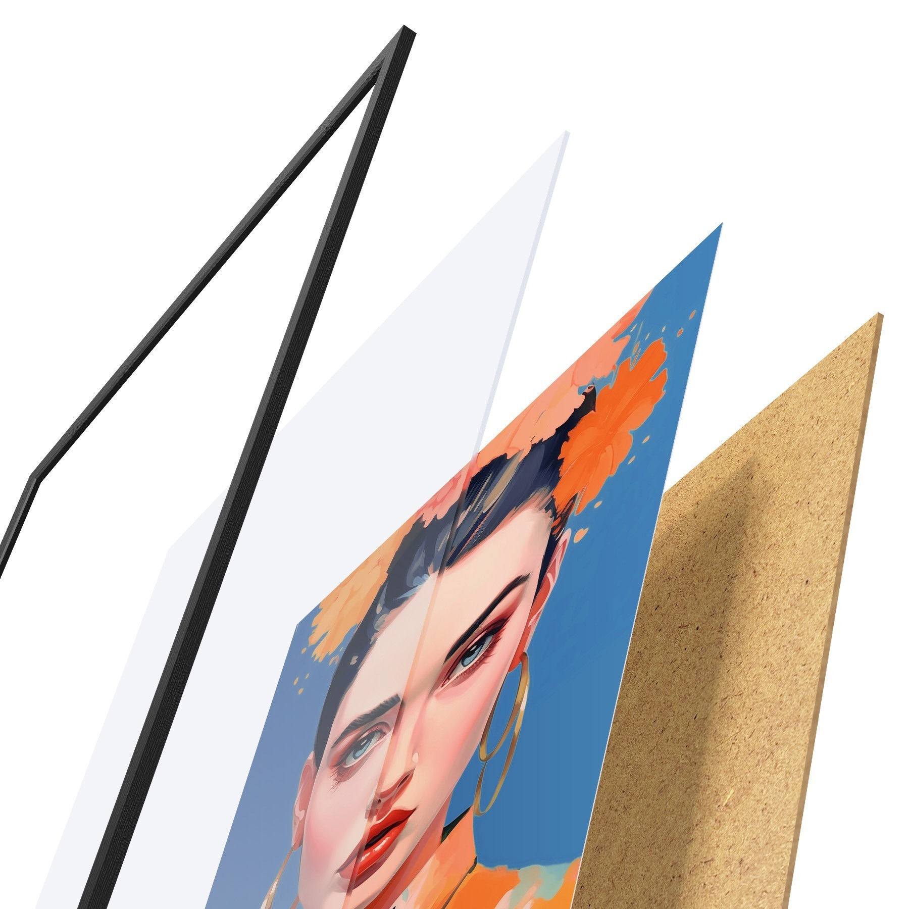 Das Poster besteht aus einem Rahmen, Plexiglas, einem gedruckten Bild und einer Rückwand aus Spanplatten. Dank der Halterungen auf der Rückseite kann das Poster sofort an die Wand gehängt werden.