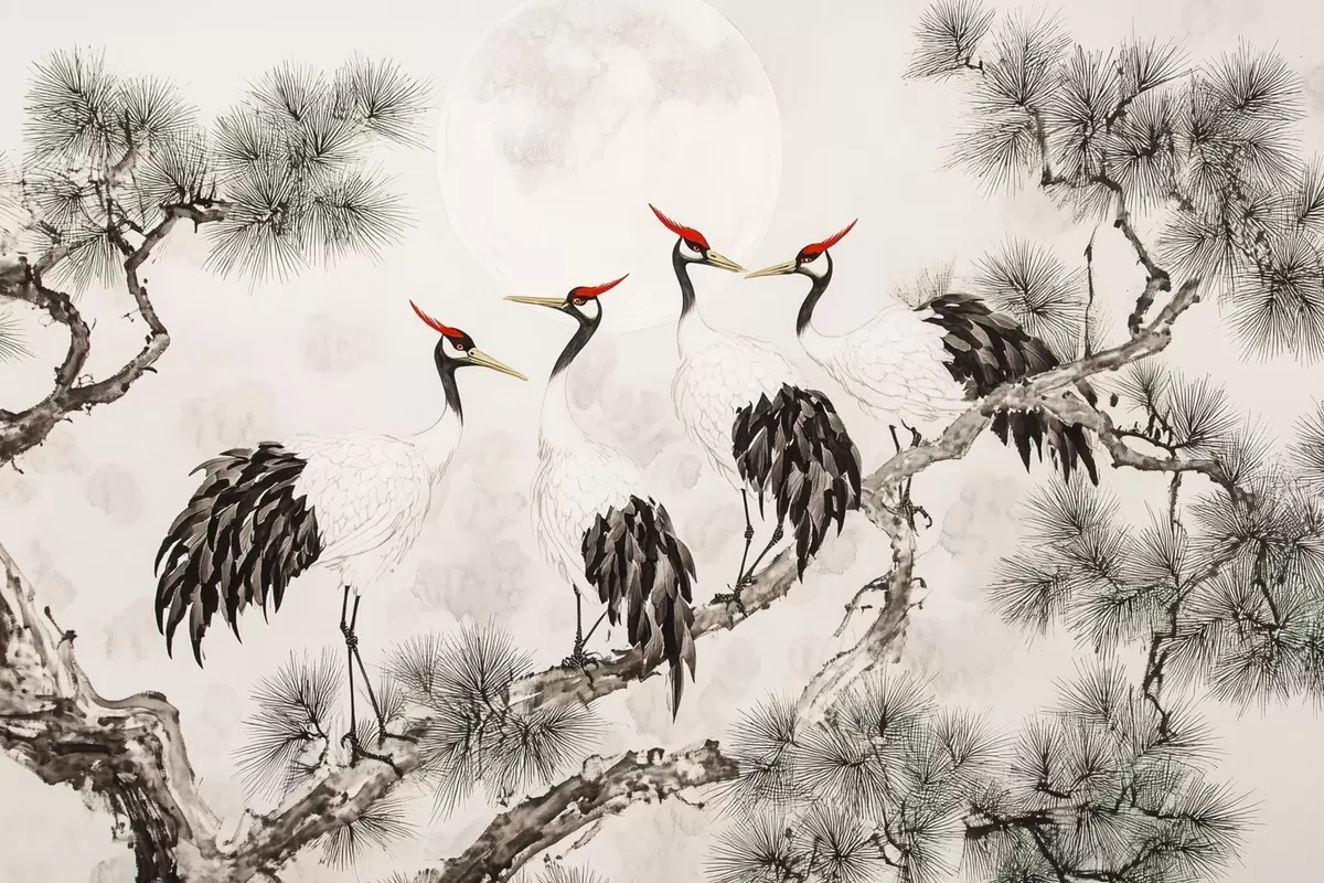 Poster Chinesische Kunst mit Kranichen und Kiefern, orientalischer Stil, Natur Nr f44503