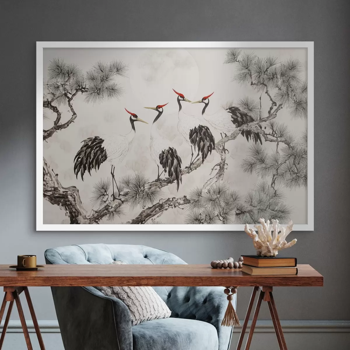 Poster Chinesische Kunst mit Kranichen und Kiefern, orientalischer Stil, Natur f44503