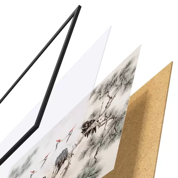 Das Poster besteht aus einem Rahmen, Plexiglas, einem gedruckten Bild und einer Rückwand aus Spanplatten. Dank der Halterungen auf der Rückseite kann das Poster sofort an die Wand gehängt werden.