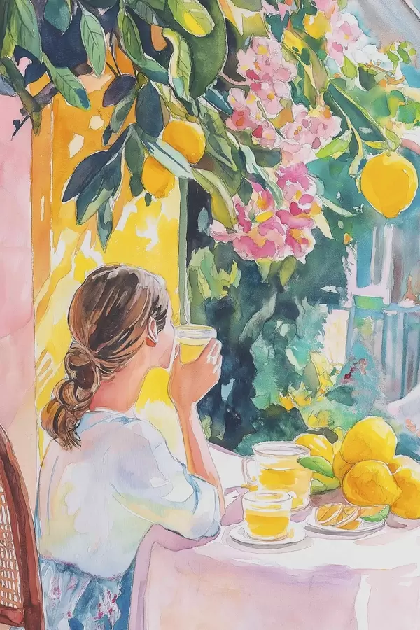 Poster Sommerstimmung, Mädchen im Cafe, Limoncello, Italien, Aquarellstil Nr f44505