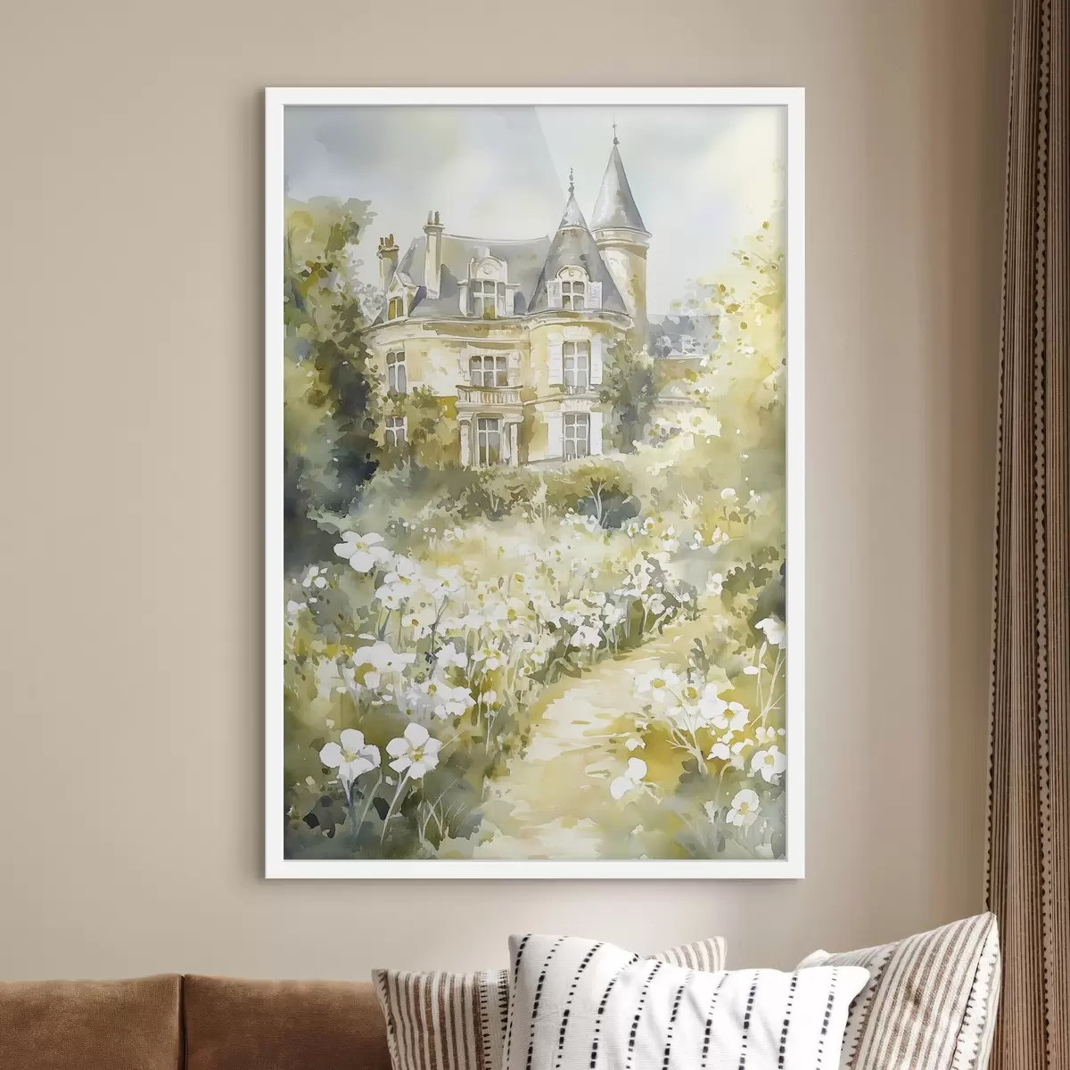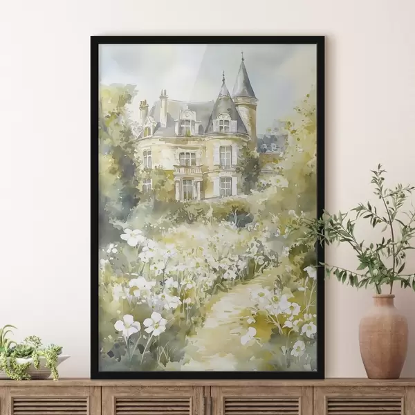 Poster Schönes Schloss mit Grünzeug und weißen Blumen, Aquarell-Stil Nr f44506