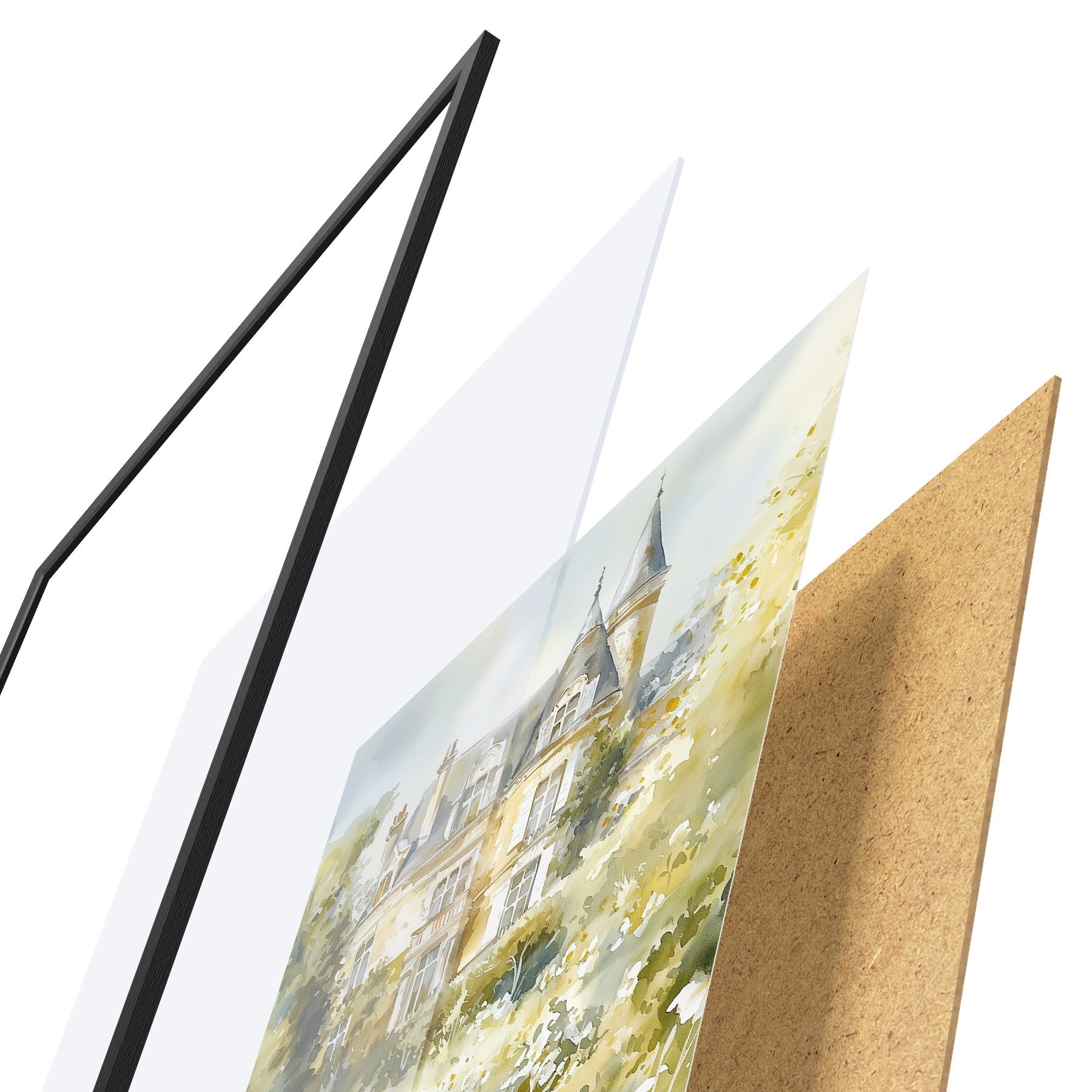 Das Poster besteht aus einem Rahmen, Plexiglas, einem gedruckten Bild und einer Rückwand aus Spanplatten. Dank der Halterungen auf der Rückseite kann das Poster sofort an die Wand gehängt werden.