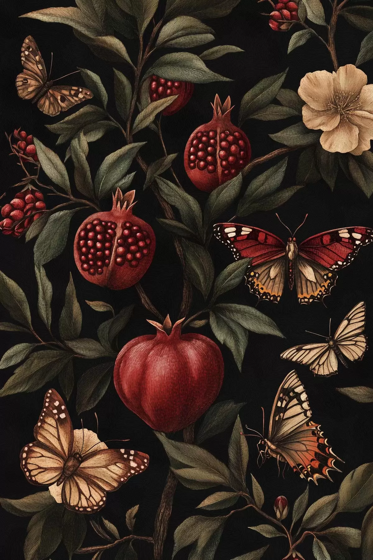 Poster Botanische Kunst mit Granatäpfeln und Schmetterlingen Nr f44511