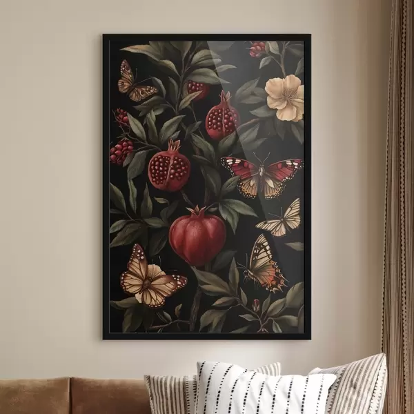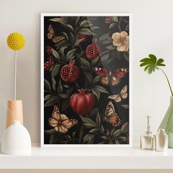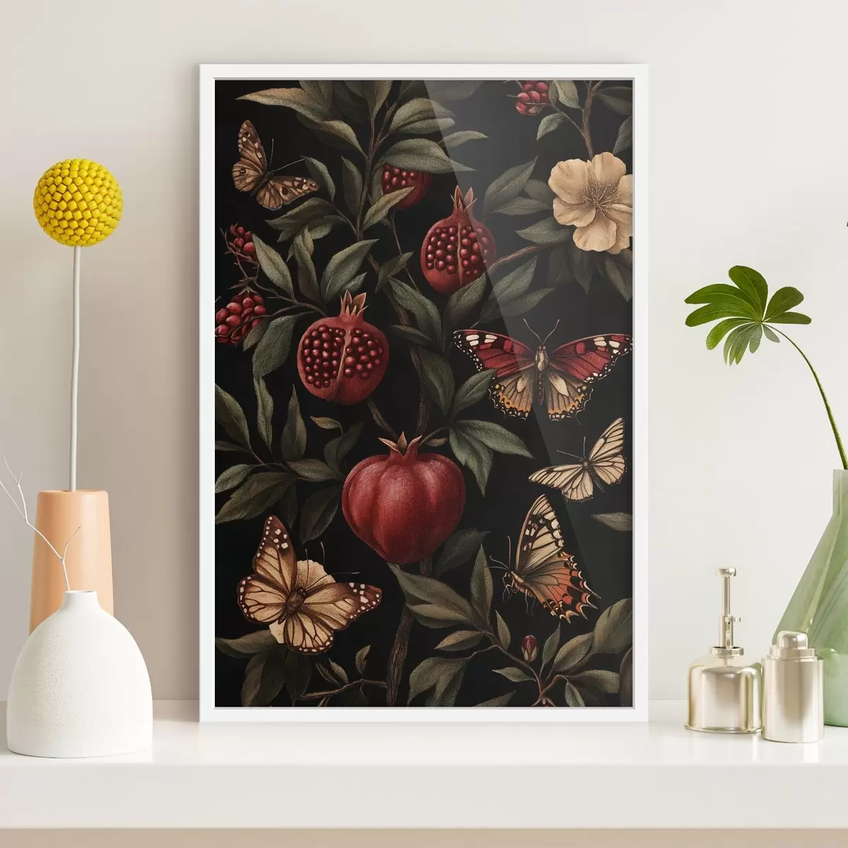 Poster Botanische Kunst mit Granatäpfeln und Schmetterlingen f44511