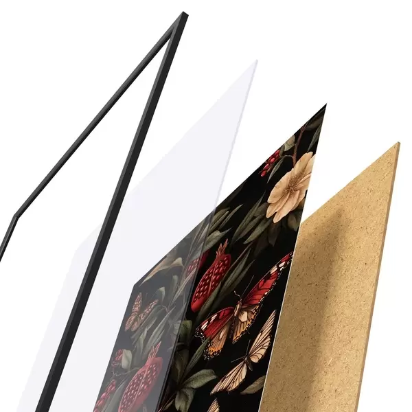 Das Poster besteht aus einem Rahmen, Plexiglas, einem gedruckten Bild und einer Rückwand aus Spanplatten. Dank der Halterungen auf der Rückseite kann das Poster sofort an die Wand gehängt werden.