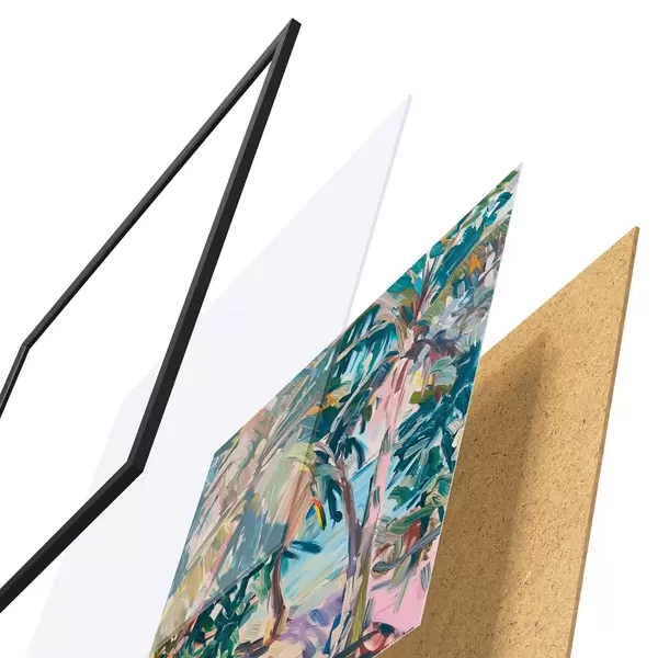 Das Poster besteht aus einem Rahmen, Plexiglas, einem gedruckten Bild und einer Rückwand aus Spanplatten. Dank der Halterungen auf der Rückseite kann das Poster sofort an die Wand gehängt werden.