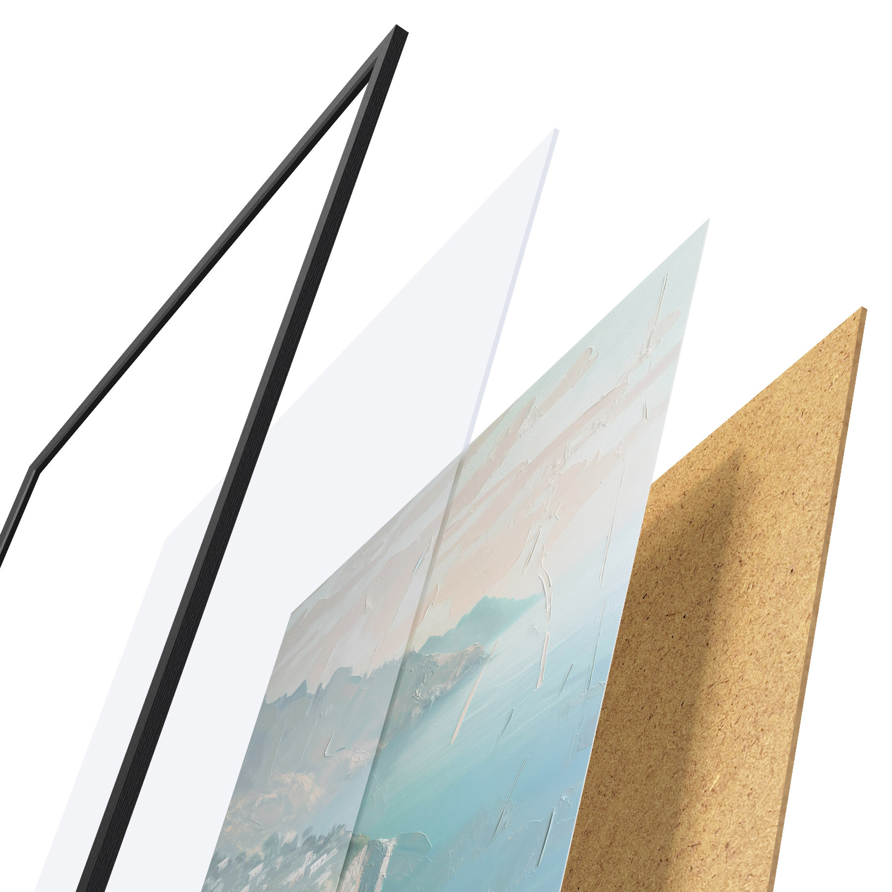 Das Poster besteht aus einem Rahmen, Plexiglas, einem gedruckten Bild und einer Rückwand aus Spanplatten. Dank der Halterungen auf der Rückseite kann das Poster sofort an die Wand gehängt werden.